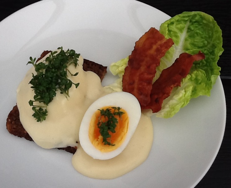 Server æggene med sennepssovsen og pynt med karse. Server rugbrød og bacon til.