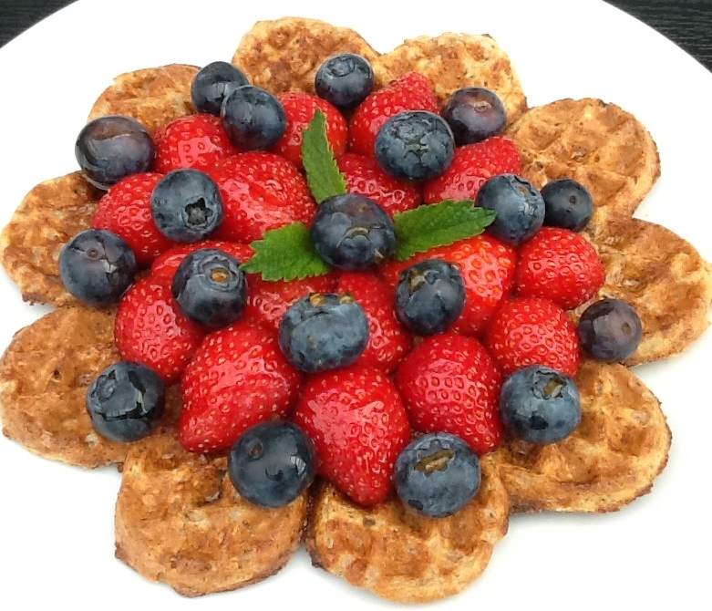 Pensl et vaffeljern med lidt olie og varm det op. Kom dej på vaffeljernet og bag til vaflen er gylden og sprød. Server vaflerne med friske bær/frugt og ahornsirup. Pynt med blade af citronmelisse.