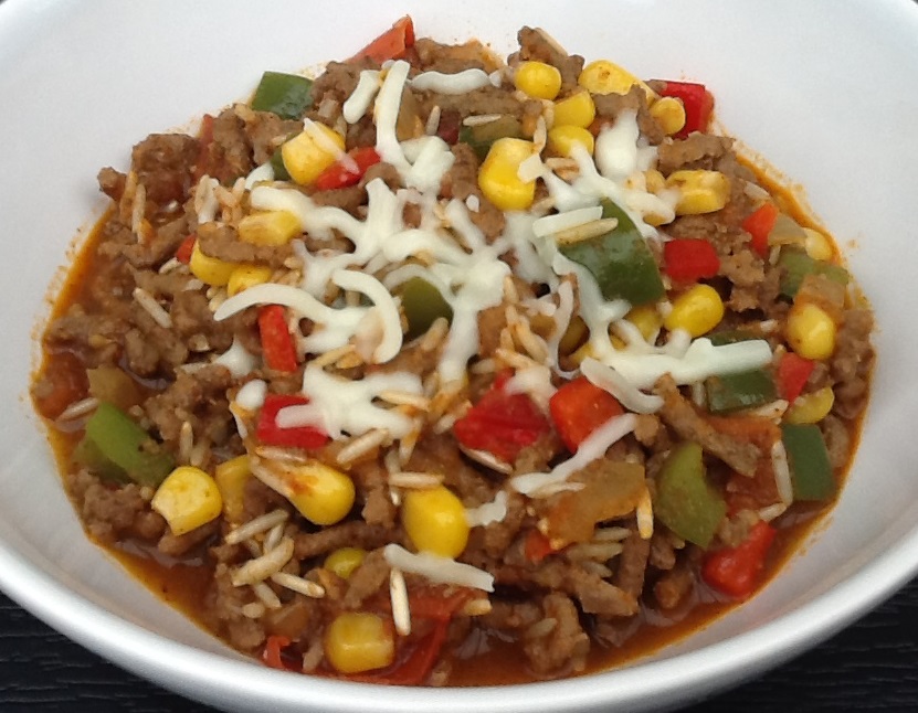 Skær løg, hvidløg, snackpeber og peberfrugt i små tern. Skær tomaterne i store tern. Brun kødet i lidt olie i en gryde. Tilsæt hakket løg og hvidløg og lad det svitse med. Tilsæt Taco Spice Mix, tomater, snackpeber, peberfrugt og ris. Kom 3 dl vand ved og kog under låg til risene er kogt. Kom evt. mere vand ved undervejs. Tilsæt majs og varm dem igennem. Server retten straks med lidt revet ost på toppen.