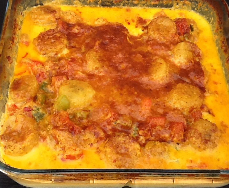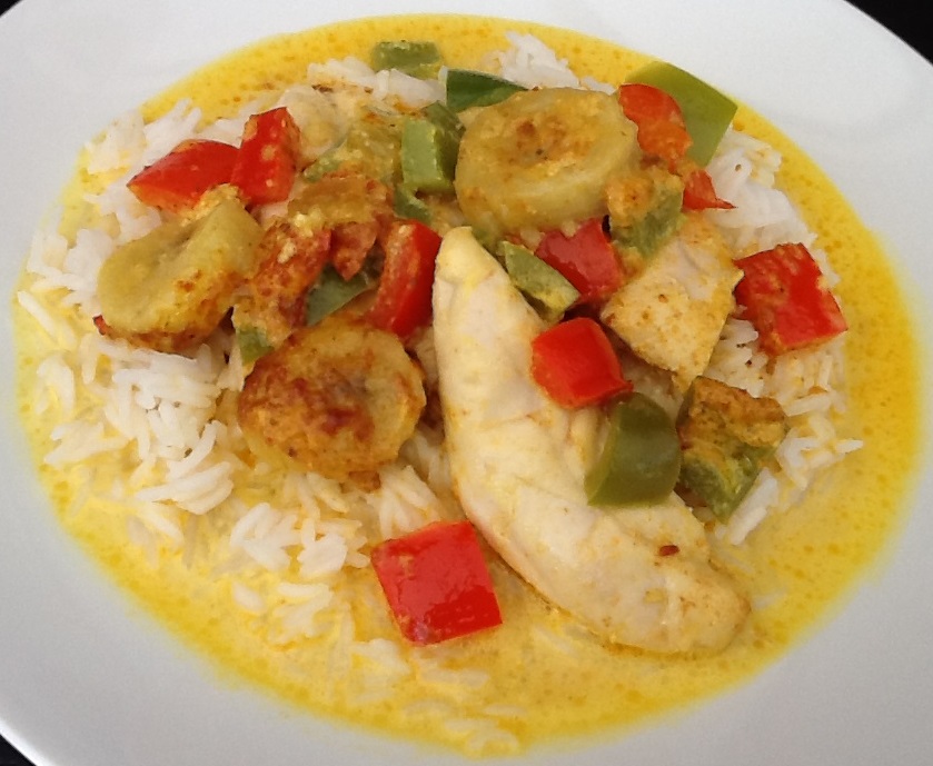 Kyllingstykkerne lægges i et fad. Bananen skæres i skiver og peberfrugterne skæres i tern. Begge dele drysses over kyllingkødet. Fløden piskes stiv og hvidløg, sambal oelek, mango chutney, salt og karry blandes i. Fordeles over kyllingefileterne.