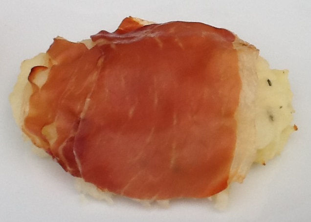 Skræl kartoflerne, skær dem i store tern og kog dem i vand i en gryde. Kog kartoflerne ved svag varme og under låg i ca. 20 minutter, til de er godt møre. Gem ca. 2 dl kogevand og hæld vandet fra. Mos kartoflerne med smør, kartoffelvand, timian og salt. Læg 18-20 bunker (a ca. ¾ dl) kartoffelmos på 2 plader med bagepapir. Del hver skive skinke i 2 og læg dem over kartoffelmosen. Gratiner øverst og nederst i ovnen i ca. 20 minutter ved 200 grader varmluft.