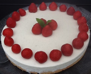 Tag en bagering på 24 cm, sæt den på en bageplade med bagepapir og tryk dejen ud i ca. ½ cm tykkelse. Bag bunden i 20 minutter ved 180 grader til den er gylden. Lad den afkøle helt.