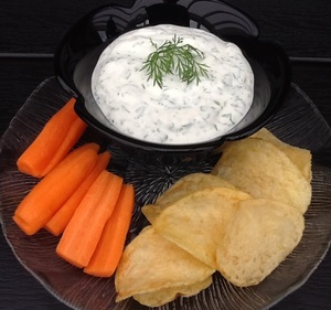 Hak dilden. Rør creme fraiche med løgpulver, hvidløgssalt, dild, salt og peber. Server dippen til gulerods- og agurkestave eller chips.