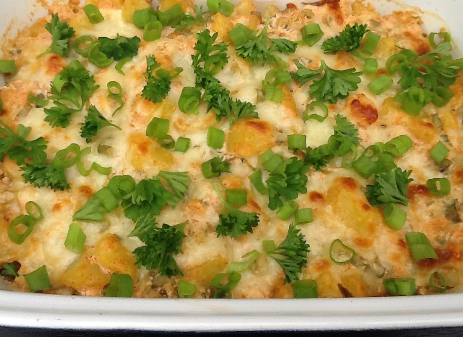 Skær kartoflerne i små tern og forårsløgene i tynde ringe. Kom creme fraiche i en skål og rør den sammen med halvdelen af osten, paprika, salt og peber. Tilsæt kartofler og forårsløg – gem lidt af den grønne top fra forårsløgene til pynt. Fordel blandingen i et ildfast fad og drys med resten af osten. Sæt fadet i ovnen og bag det ved 200 grader i 20-25 minutter til toppen er gylden og osten smeltet. Pynt med lidt grønt fra forårsløgene og persille.