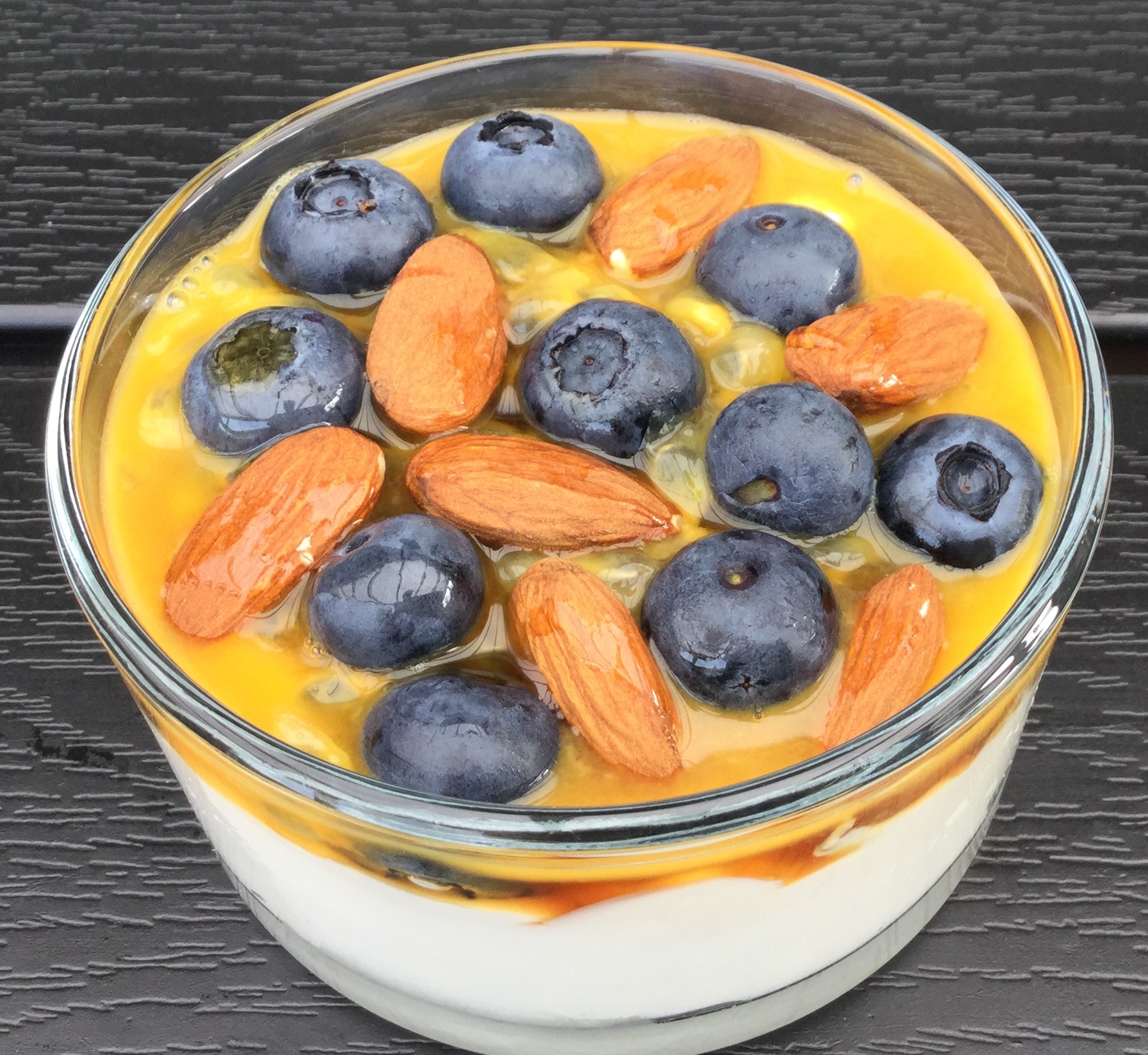 Kom græsk yoghurt i et glas. Skær passionsfrugten over og skrab frugtkødet ud over yoghurten. Pynt med blåbær og mandler. Dryp lidt ahornsirup over.