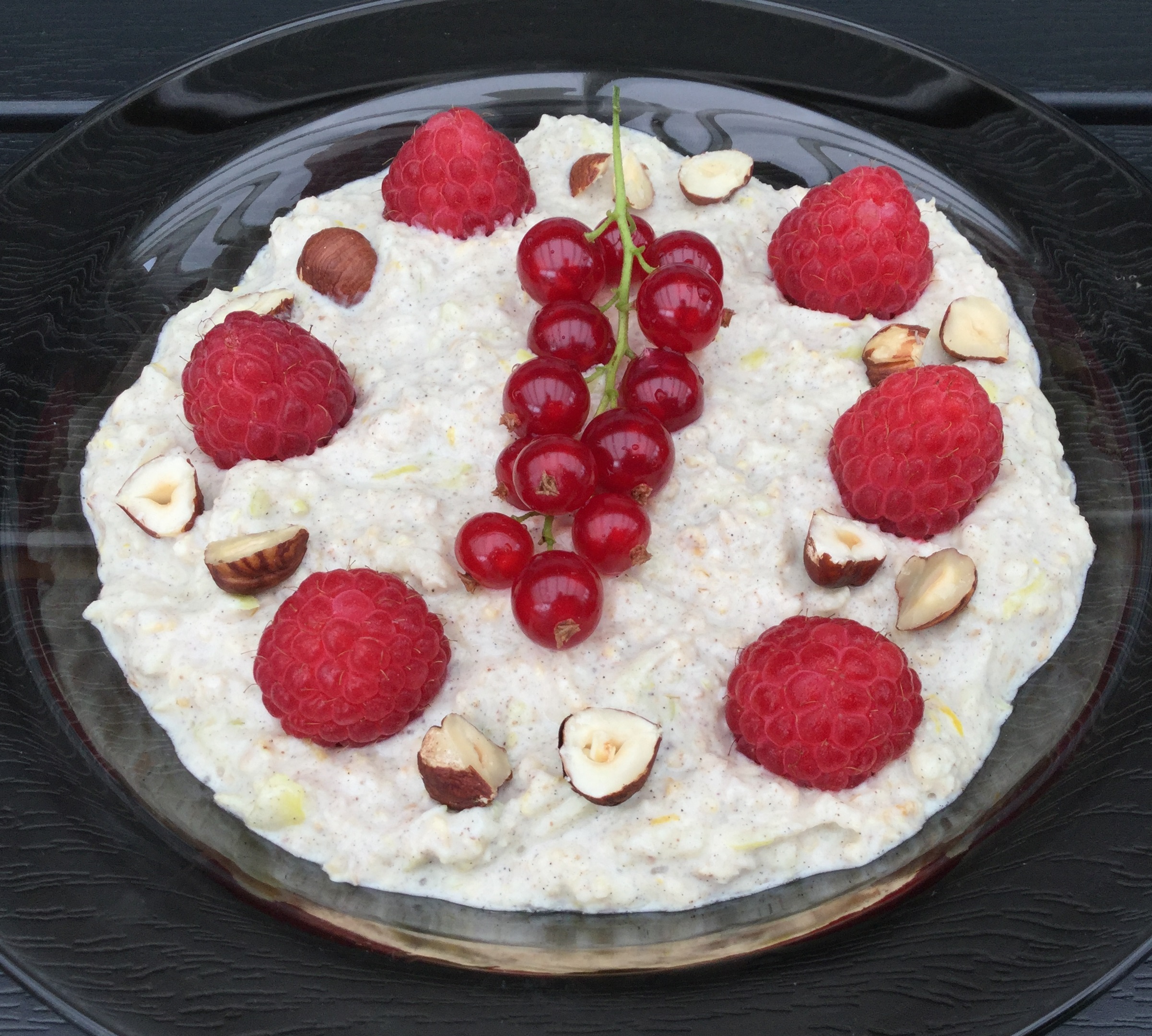 Rør havregryn, mælk, vanillepulver og revet citronskal sammen. Læg låg på skålen og stil den på køl natten over.