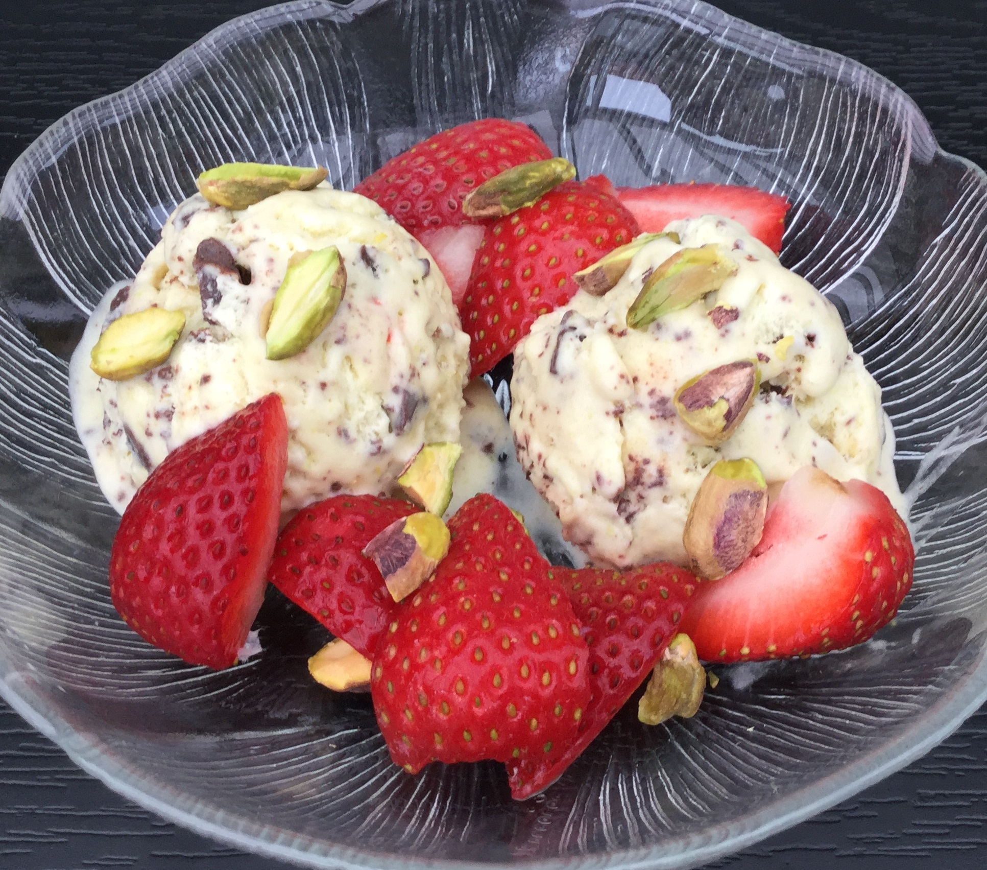 Hak chokoladen. Pisk æggeblommer og sukker luftige og rør pistaciemassen i. Pisk fløden og æggehviderne stive hver for sig, vend dem forsigtigt i pistaciemassen sammen med den hakkede chokolade. Kom iscremen i en egnet beholder og stil den i fryseren i mindst 4 timer. Pistacieisen kan kugles op direkte fra fryseren. Pynt med jordbær og pistaciekerner ved servering.