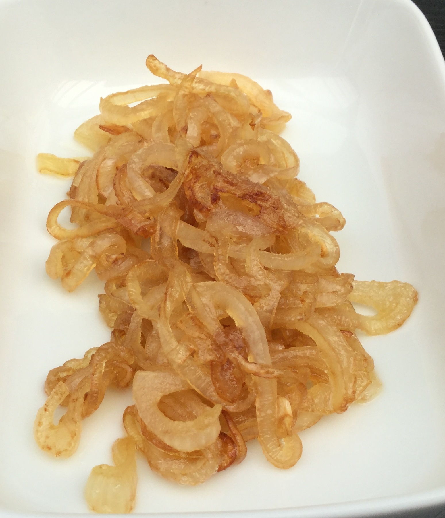 Løget pilles og skæres i tynde skiver. Kom smør og olie på en pande og varm det op. Kom løgskiverne på og drys sukker over. Vend jævnligt i løgene mens de steges gyldne ved svag varme.