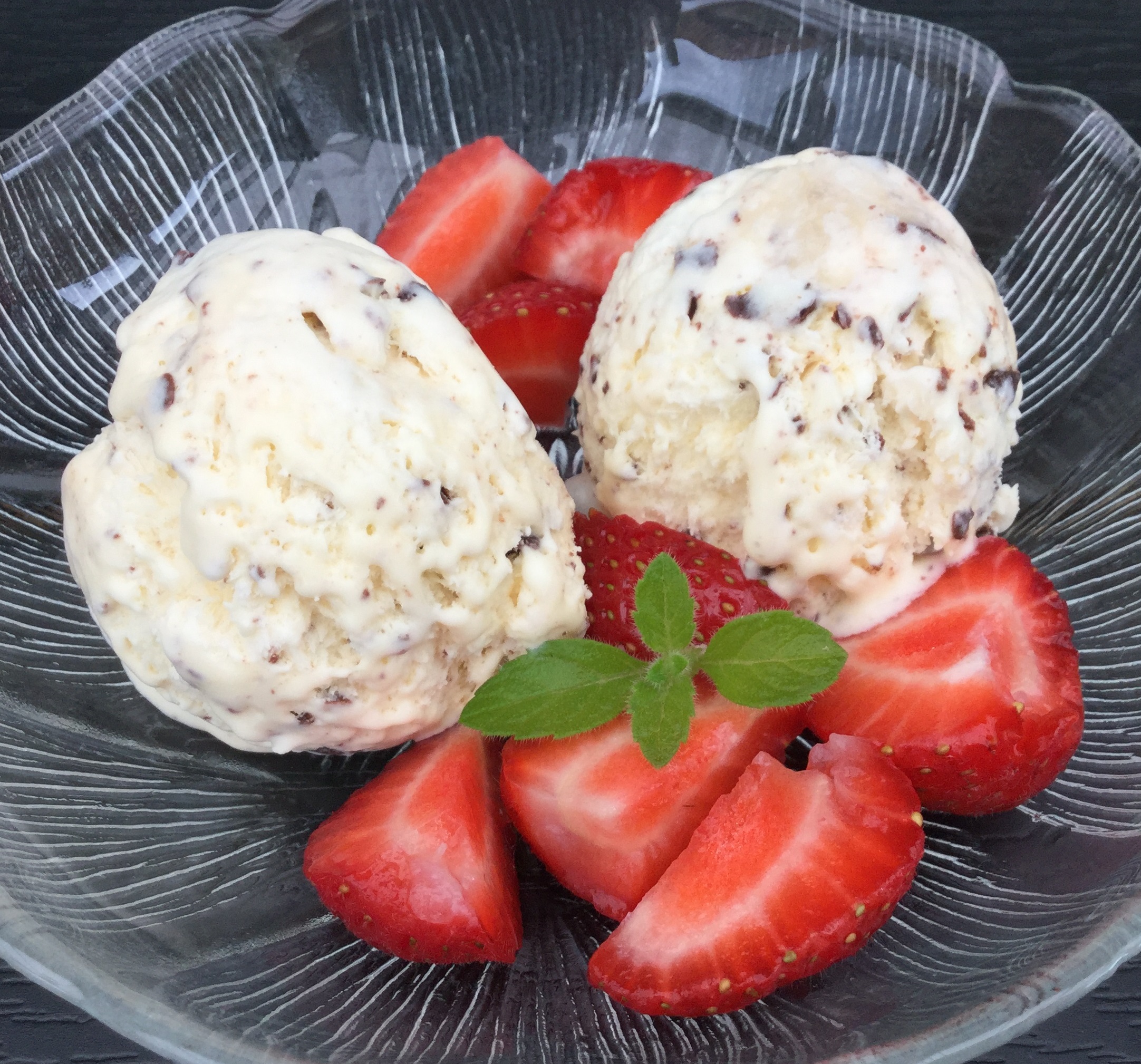 Hak chokoladen. Pisk æggeblommer og sukker hvidt og luftigt. Pisk fløden til flødeskum. Vend flødeskum i æggesnapsen. Kom hyldeblomstsaft og hakket chokolade i og vend rundt. Kom iscremen i en egnet beholder og stil den i fryseren natten over. Ved servering kugles isen op og pyntes med jordbær og mynte.