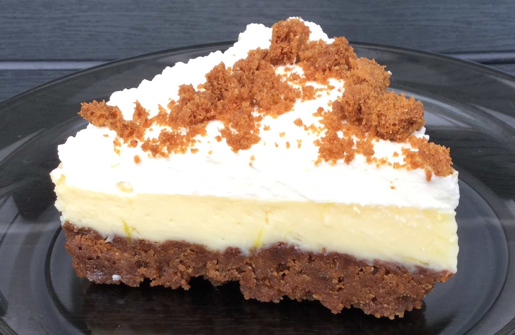 Pisk fløden til skum og fordel det over den kolde tærte. Knus de 2 Bastognekiks groft, og drys dem over tærten.