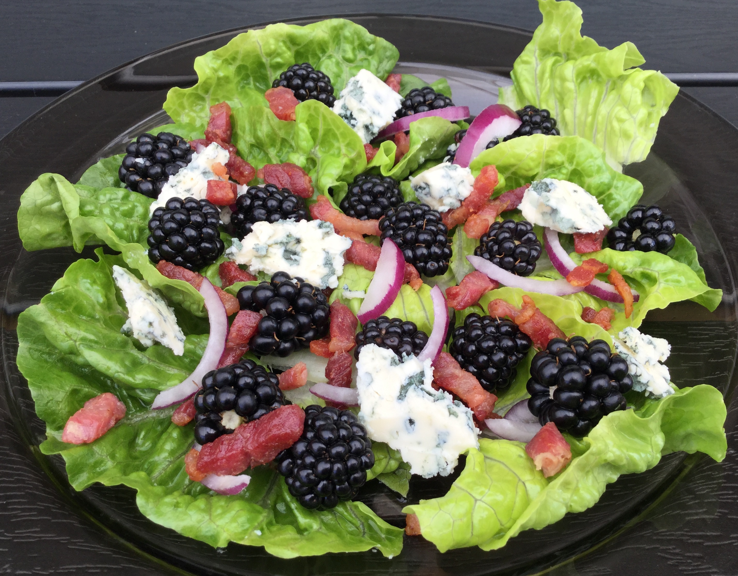 Pluk hjertesalathovederne i mindre stykker. Halver rødløget og skær det i tynde skiver. Danablu skæres i mindre stykker. Bland salat og rødløg. Anret salaten på et fad. Fordel brombær, bacon og ost på salaten. Server med dressing og ristet rugbrød.