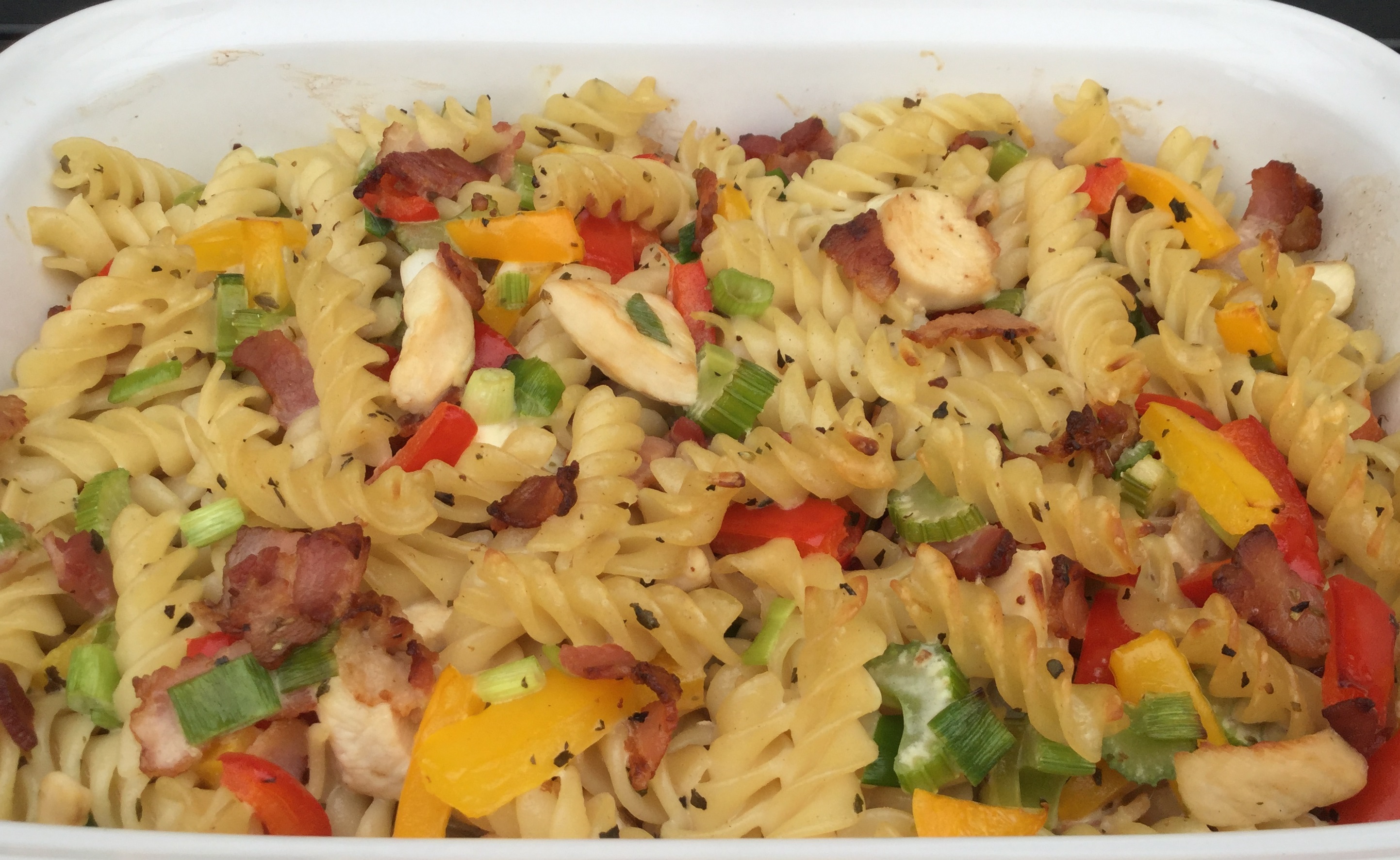 Svits baconen på panden til den er næsten sprød. Kom kyllingtern ved og steg et par minutter. Tilsæt forårsløg og steg yderligere et par minutter. Hæld blandingen i et ildfast fad. Kom pastaen ovenpå.