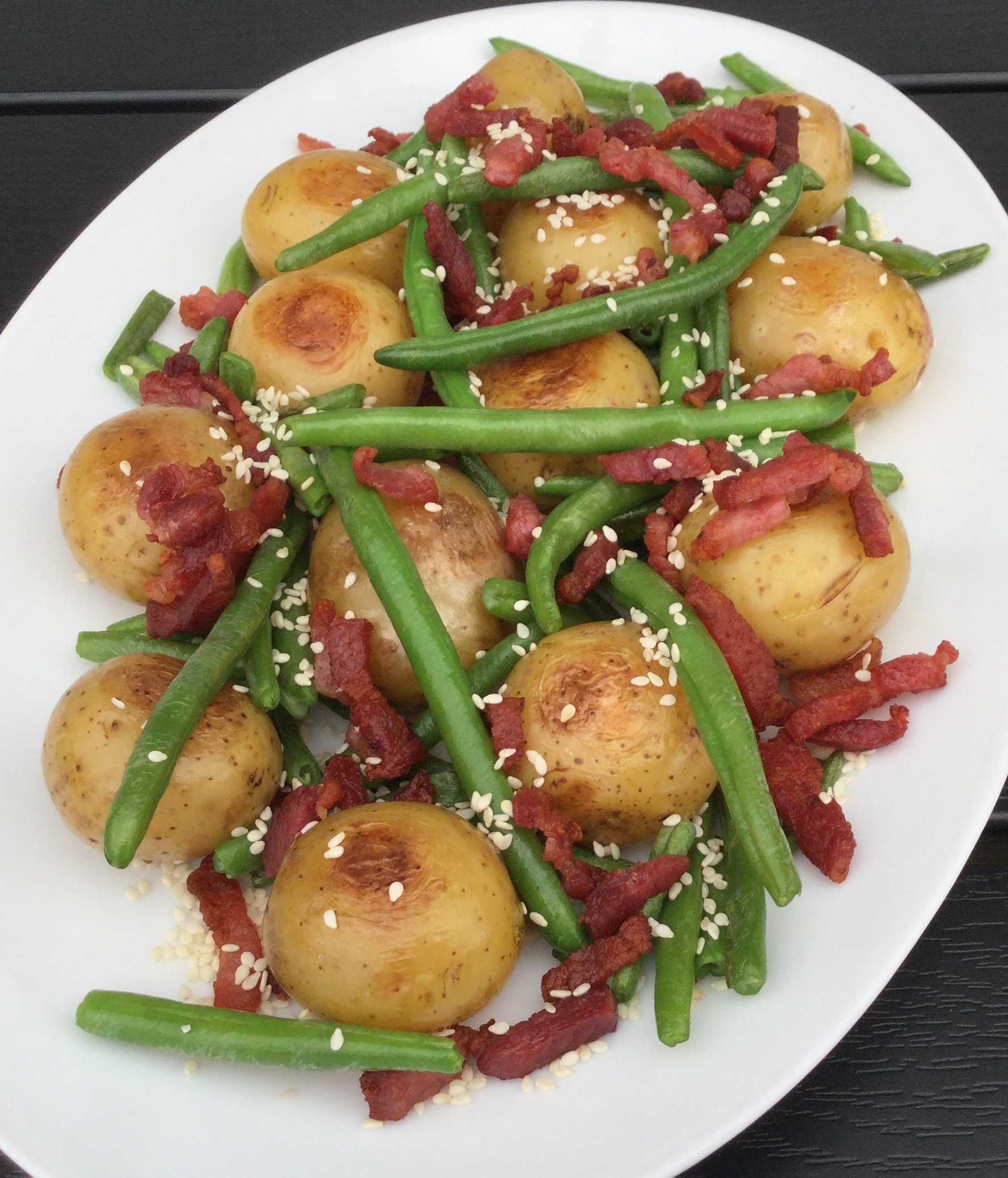 Rist de kogte kartofler og bønner i lidt olie på panden. Drys med salt. Anret dem på et fad sammen med bacontern. Drys med sesamfrø.