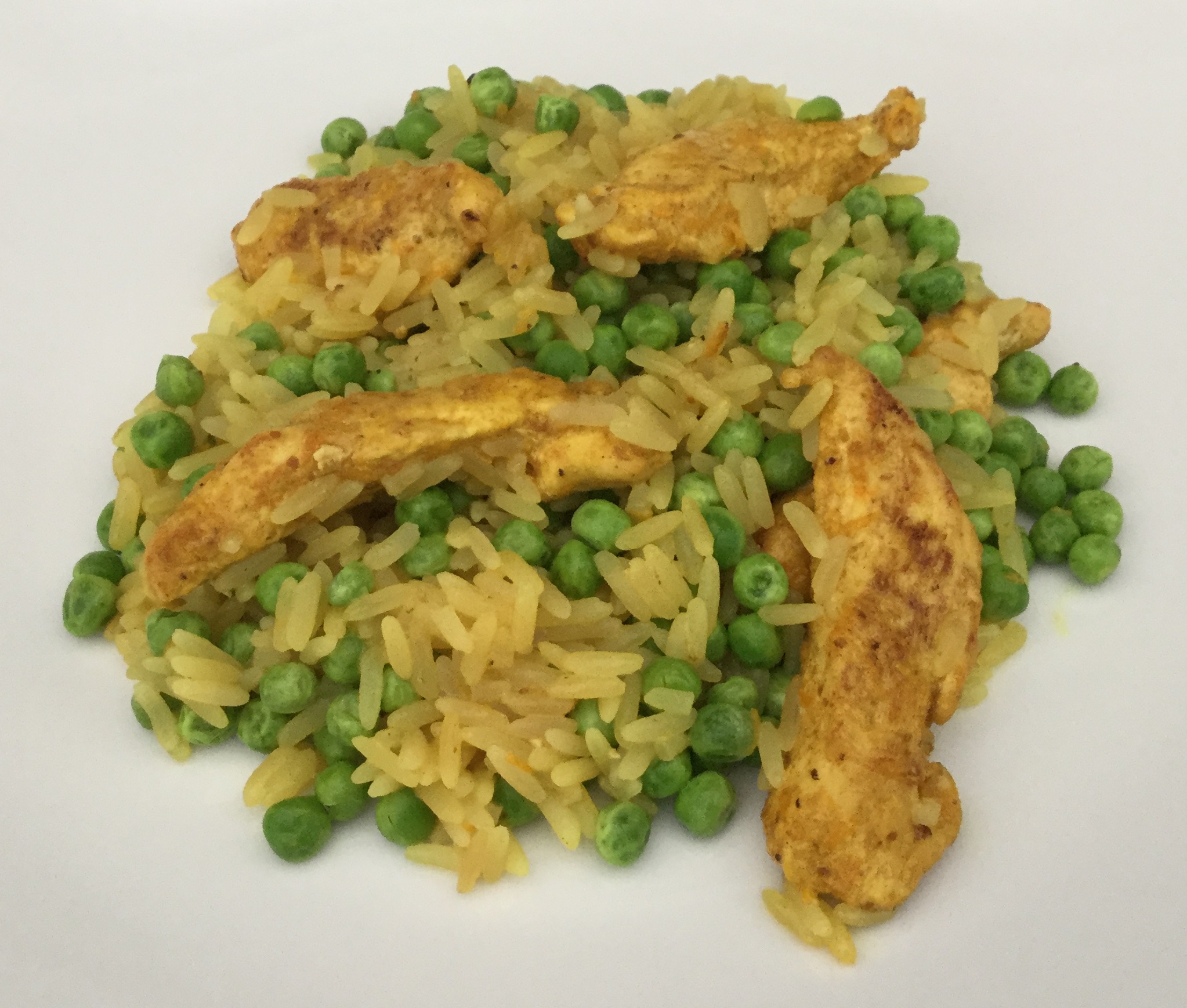 Riv appelsinskallen fint og bland den med farin og karry. Pres saften af appelsinen. Skær kyllingebrystet i mindre stykker og vend dem i krydderiblandingen. Brun kyllingestykkerne i olie på panden. Vend så risene i og tilsæt appelsinsaft og bouillon. Bring det i kog under omrøring og lad det simre under låg til risene er møre. Tilsæt ærter og varm retten igennem. Smag til med salt. Server straks.