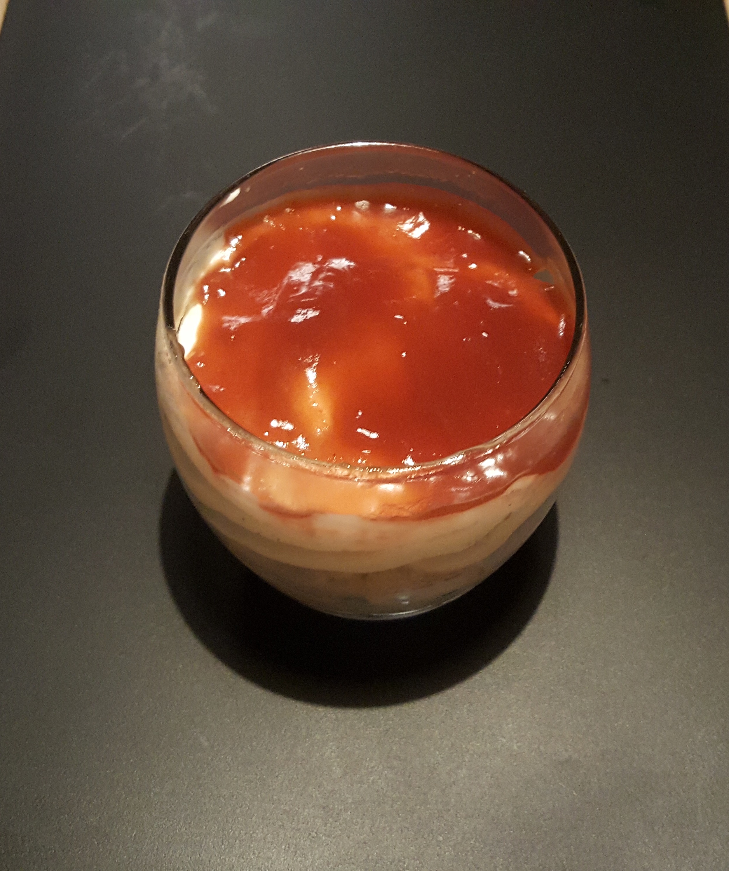 Kom først et lag ostemasse i glassene og kom kiks ovenpå, kom endu et lag ostemasse på, drys med kiks og afslut nu med ostemasse. Kom den ønskede marmelade på som topping.