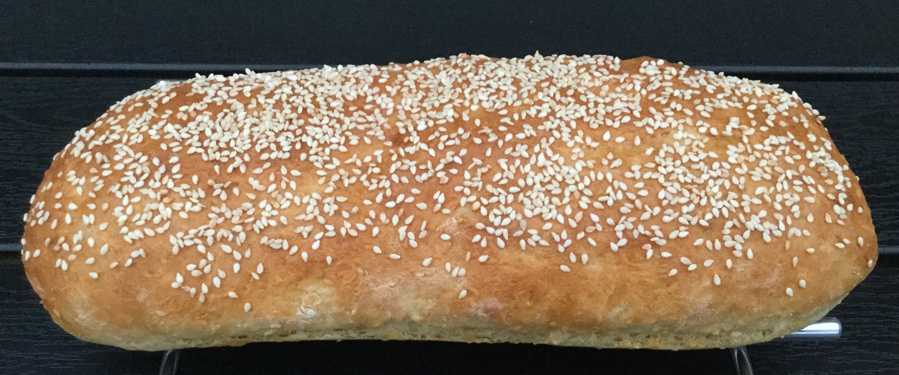 Riv de kogte kartofler groft. Kom mælken i en skål og rør gæren ud heri. Tilsæt salt, sukker og olie. Rør kartofler, sesamfrø og mel i og ælt dejen godt. Lad den hæve ca. 1 time. Del dejen i 2 og form to aflange brød. Lad brødene efterhæve i 20 minutter. Pensl brødene med sammenpisket æg og drys med sesamfrø. Rids brødene med en skarp kniv og bag dem ved 185 grader i ca. 35 minutter.