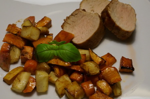 750 g blandede rodfrugter (f.eks. med sød kartofler, hvidløg, rødbeder, pastinak, jordskokker og løg).