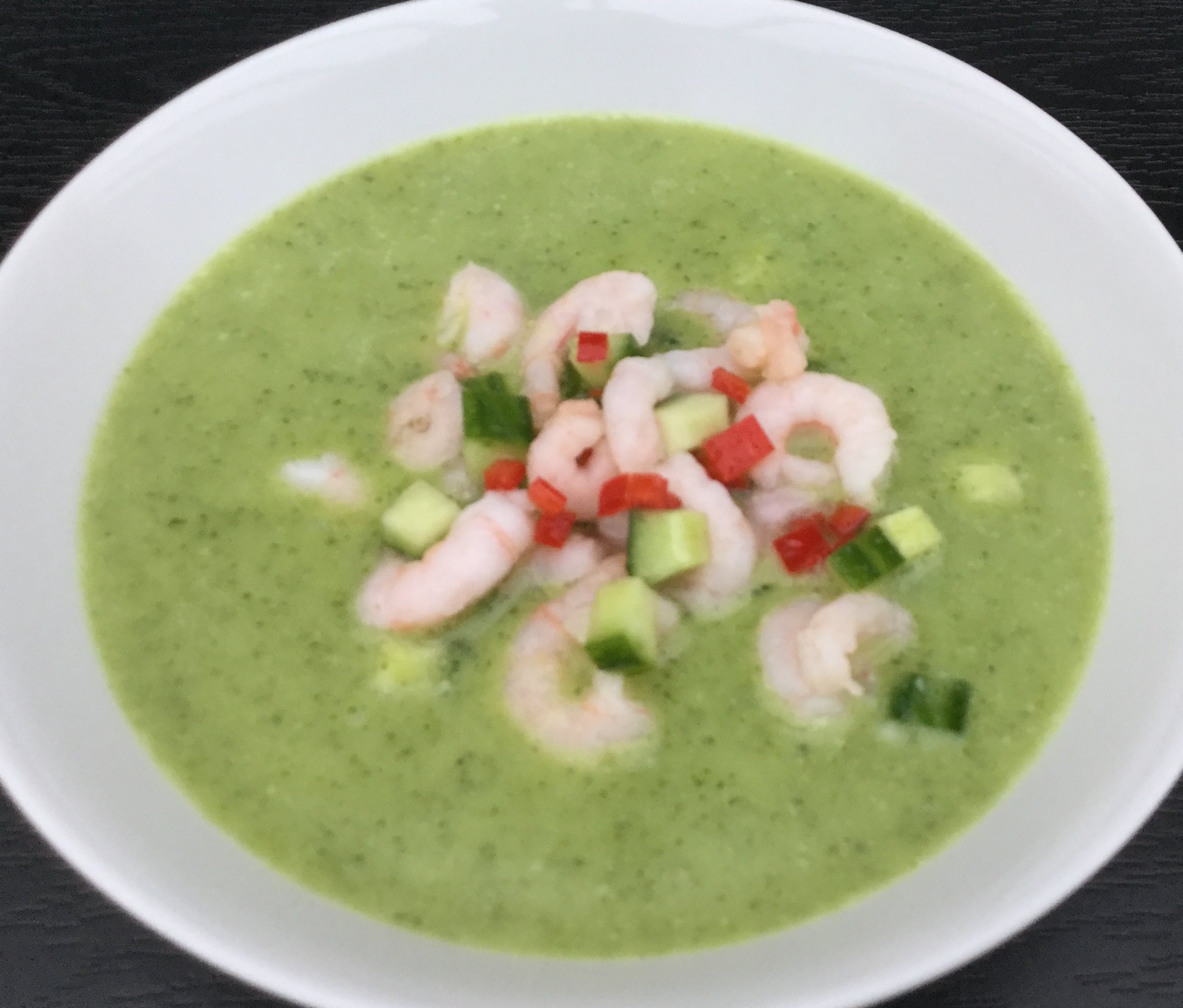 Blend den kogte broccoli og bouillonen med en stavblender. Tilsæt creme fraiche, 1 spsk. olie og smag til med salt og peber. Blend kort. Server suppen med rejefyldet.