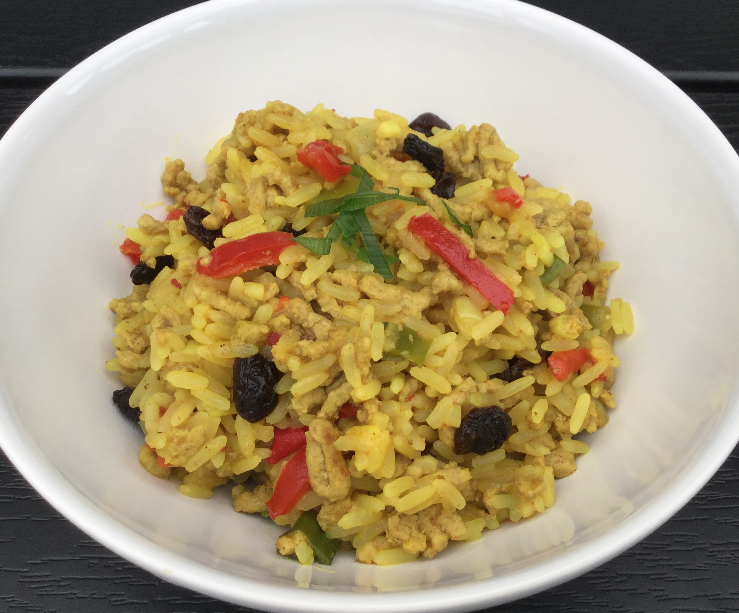 Skær løg og hvidløg i tern. Snit forårsløg fint og skær peberfrugten i strimler. Varm lidt olie op i en gryde og brænd karryen af. Svits løg og hvidløg i olien. Kom fars og sukker i og svits videre. Tilsæt grøntsagerne og lad dem svitse et øjeblik. Krydr med gurkemeje, salt og peber. Tilsæt ris, vand og bouillontern. Kog til risene er færdige. Rør i retten undervejs og tilsæt evt. mere vand. Tilsæt rosiner og varm retten igennem. Smag retten til med krydderier og server.