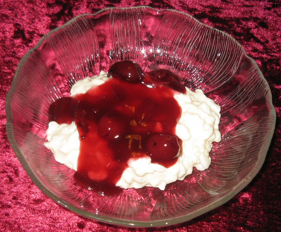 Risengrøden afkøles og røres med sukker og mandelessens. Piskefløden piskes til flødeskum, som vendes i risengrøden. Serveres med lun kirsebærsovs.