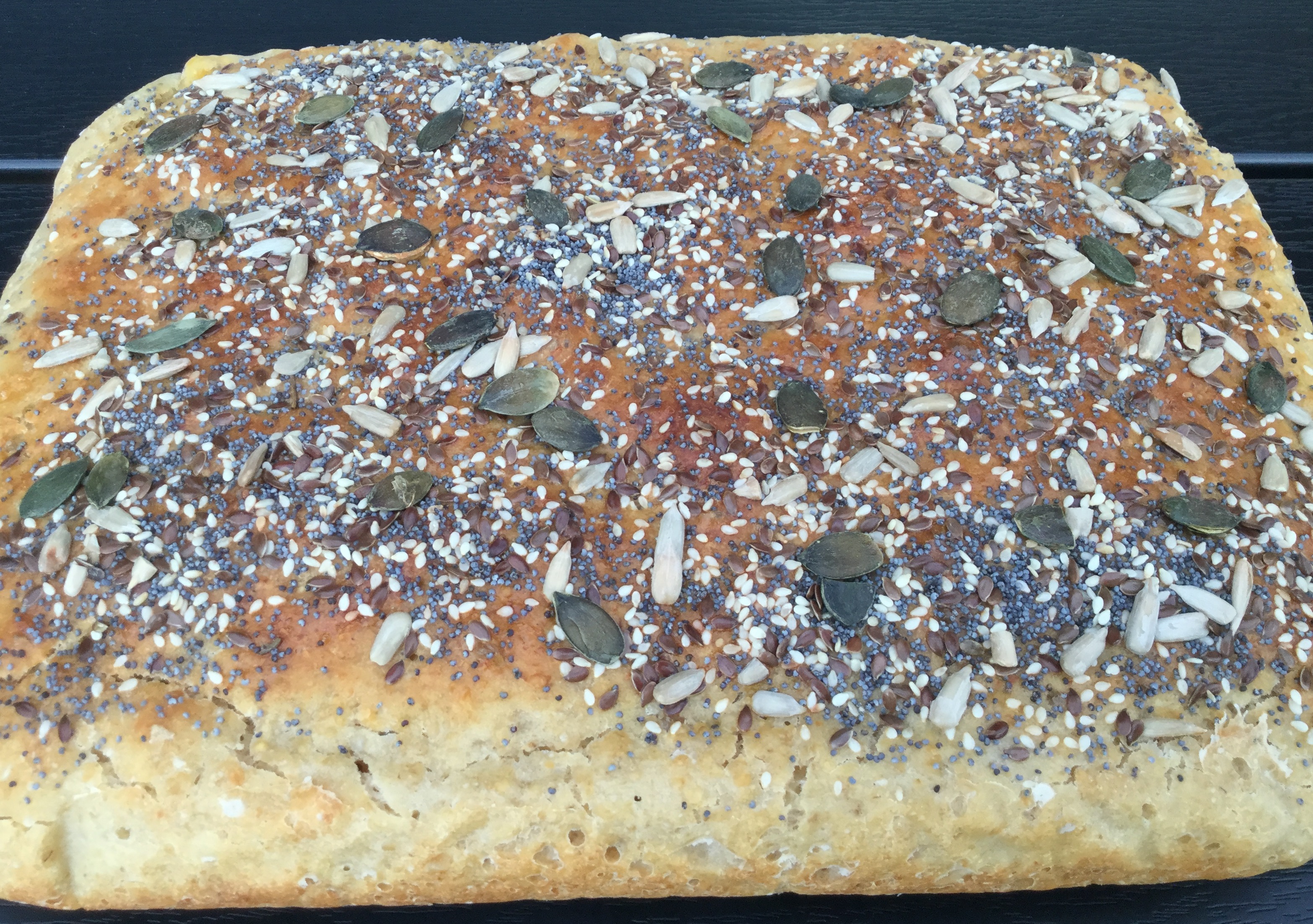Tag dejen ud og vælt den i en bradepande 30 x 20 cm foret med bagepapir. Glat dejen ud med en våd håndflade, så den fylder formen ud. Lad den hæve tildækket i 2 timer.