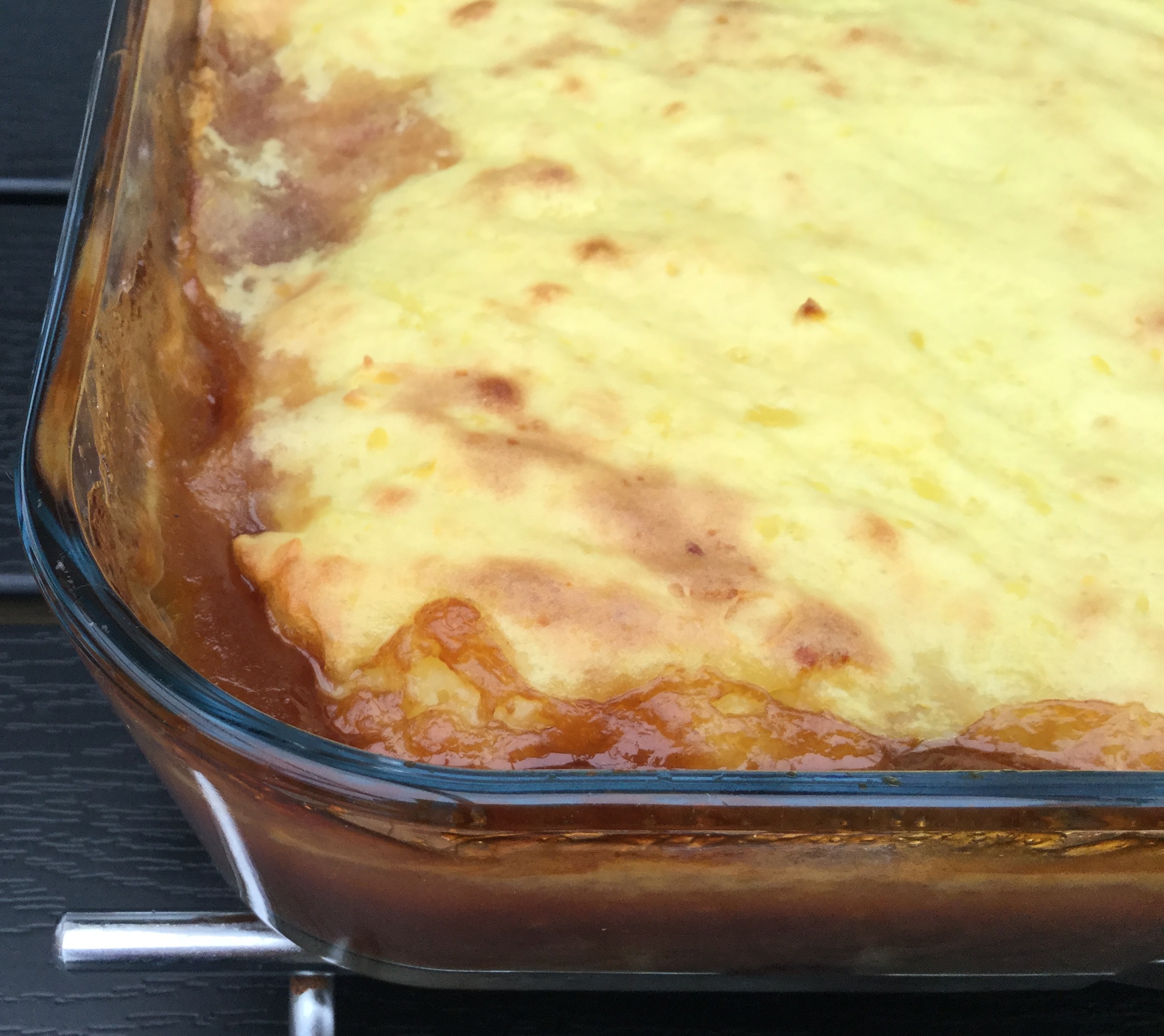 Kødskiverne lægges i et ovnfast fad. Sovsen smages til med engelsk sovs og fordeles over stegen. Asierne skæres i små tern og fordeles over sovsen. Læg et lag kartoffelmos øverst. Bag retten i ovnen i ca. 40 minutter til overfladen er gylden.