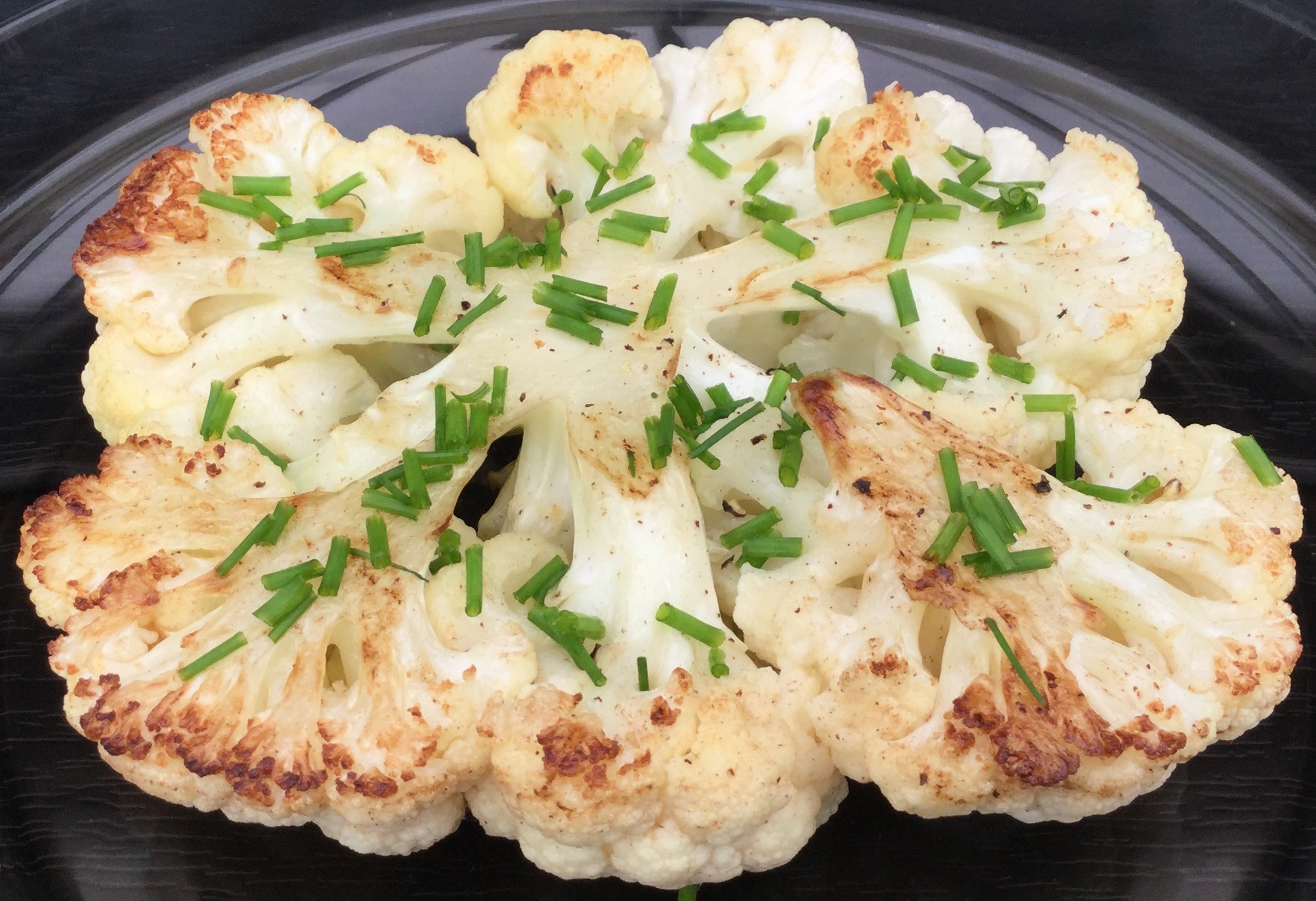 Skær 1 cm af top og bund af blomkålen og flæk den igennem på tværs til to "blomkålsbøffer". Steg de store blomkålsbøffer i en blanding af olie og smør til de er gyldne på begge sider. Krydr med salt og peber. Læg evt. et låg på panden de sidste par minutter. Drys med hakket purløg eller persille ved servering.