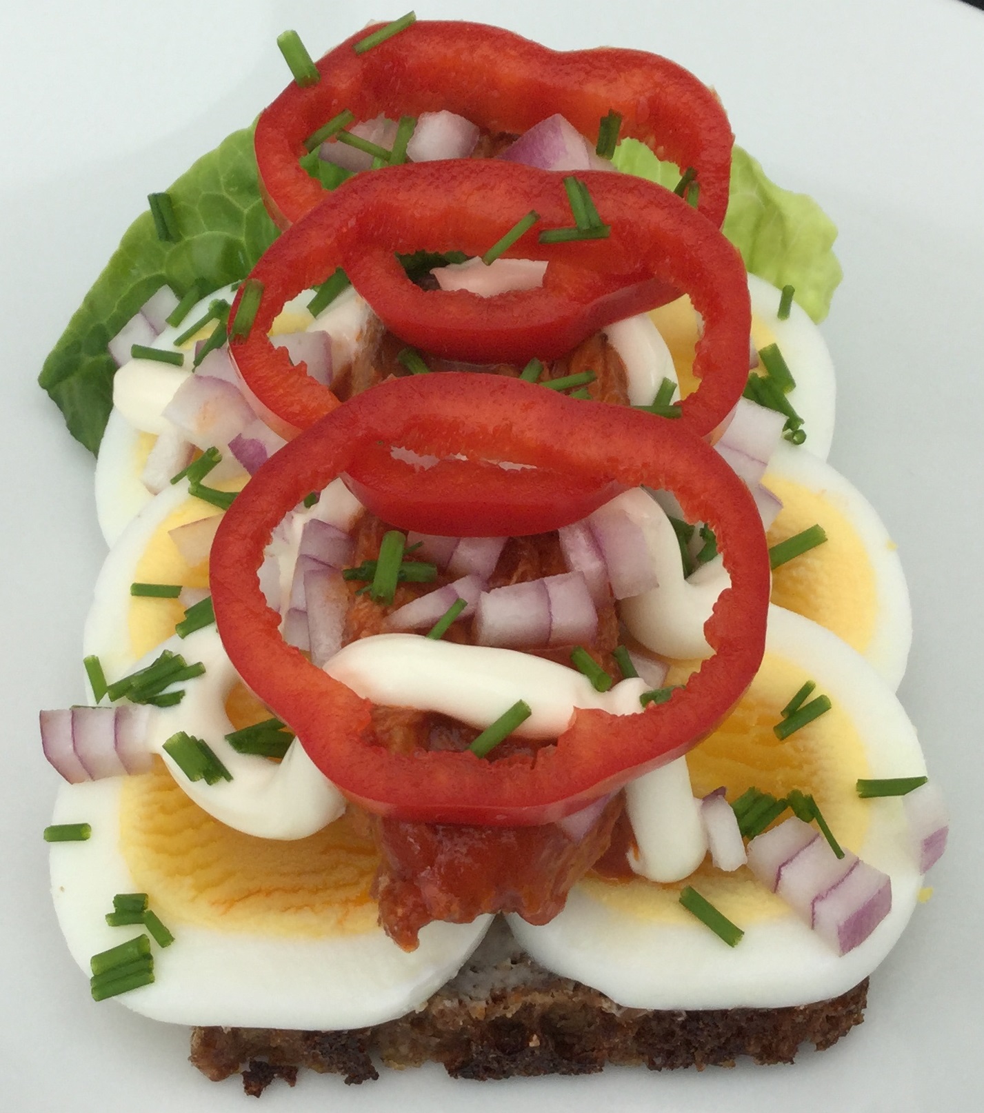 Smør rugbrødsskiven og læg et salatblad på. Skær ægget i skiver i en æggedeler og læg 6 skiver på rugbrødet (2 rækker med 3 i hver). Tag en makrelfilet op af dåsen, dup evt. lidt af tomatsovsen af og læg den ovenpå æggene. Kom lidt mayonnaise på. Skær løgskiven i tern og drys dem over æggemaden. Læg tre skiver snackpeber på makrelfileten. Hak purløg og drys det over æggemaden. Kværn lidt sort peber over til sidst.