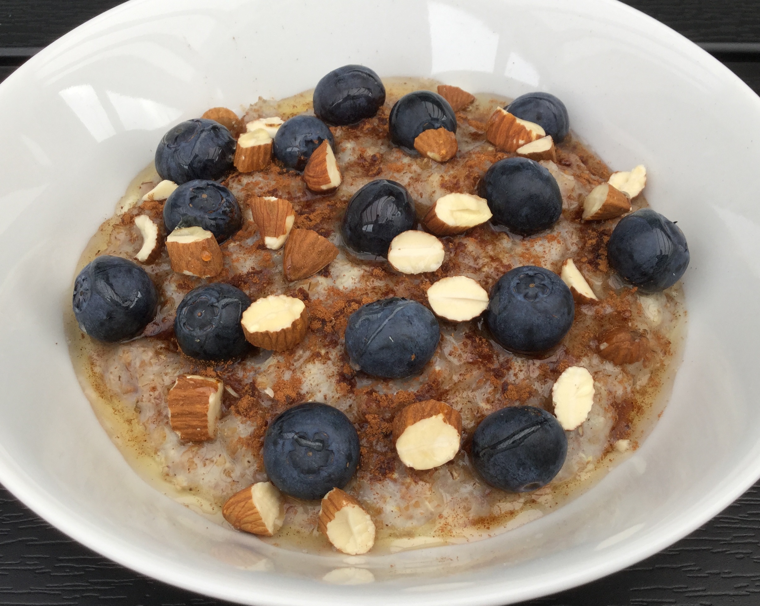 Kom ruggryn, vand og mælk i en kasserolle og kog ca. 1 minut under omrøring. Rør salt i. Anret grøden med kanel, blåbær, mandler og akaciehonning.
