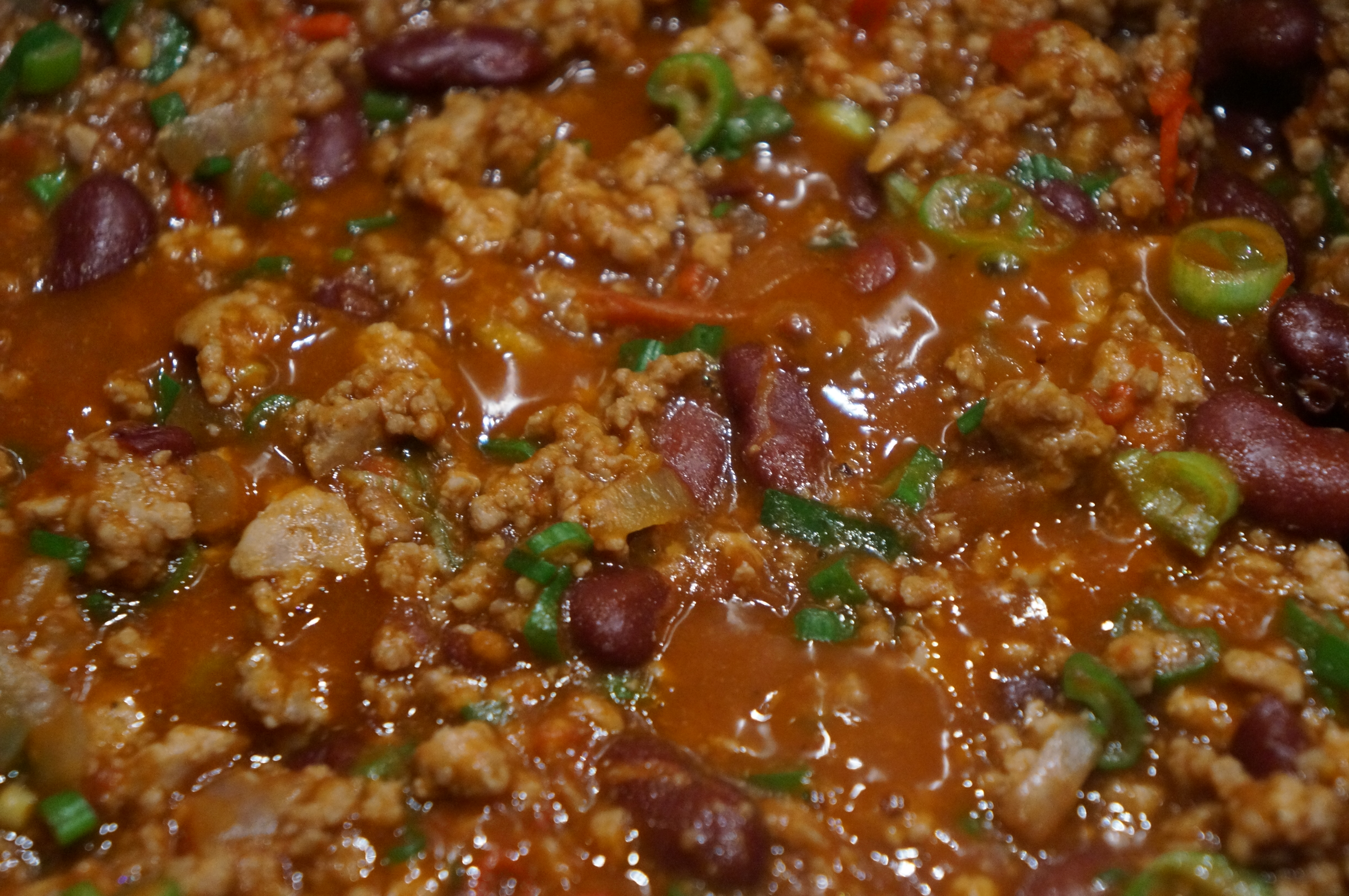 Brun kødet i en gryde med olie. Hak løget og chilien fint. Kom det i til kødet og rør rundt. Pres hvidløg i. Lad det sautere nogle minutter. Tilsæt de hakkede tomater og spidskommen. Lad det simre i 10 minutter. Vend fintsnittede forårsløg i og smag til med salt og peber.