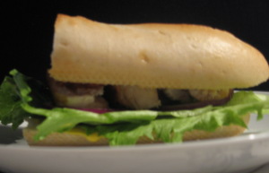 Steg kyllinge fileterne på en pande. Klip bacon strimlerne i mindre stykker og steg dem til de er sprøde. Halver baguetterne både på langs og på tværs og lun dem i ovnen. Når kyllinge fileterne er steg skæres de i strimler på den korte led af ca. 1 cm tykkelse.