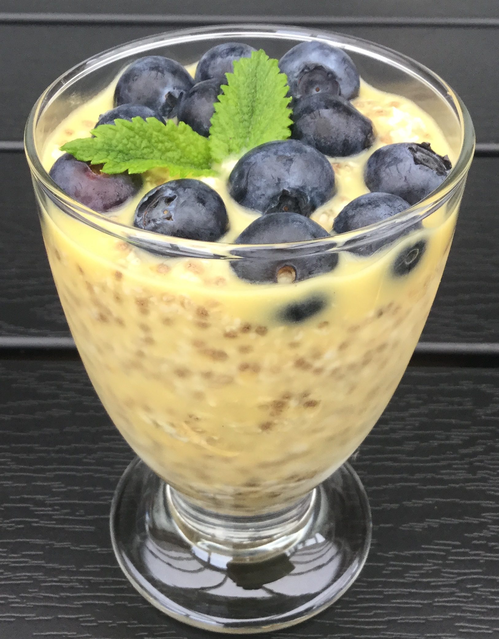 Rør grøden igennem. Pynt med blåbær og citronmelisse.
