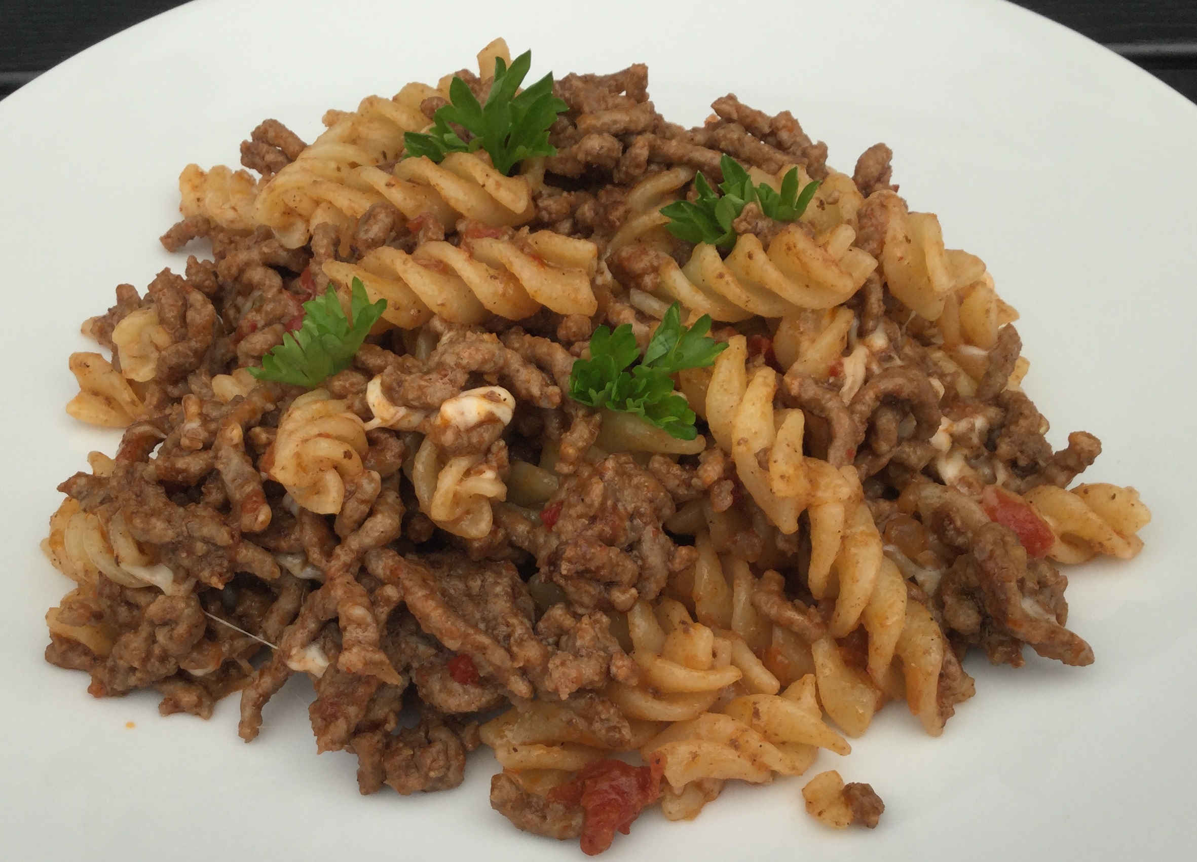 Brun kødet i olie på panden. Tilsæt tacokrydderi og rør godt. Kom salsaen på og rør igen. Steg videre ved lav varme og smag til med salt og tacokrydderi. Hæld kødet over den kogte pasta. Vend kød og pasta sammen, tilsæt osten og vend den i retten.