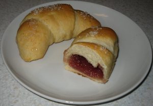 Dejen æltes og deles i fire stykker. Rulles ud til fire cirkler, som hver skæres i 6 stykker. Fyldet fordeles på de 24 trekanter i den brede ende. Hjørnerne lukkes ind over fyldet og hornet trilles, så snippen ligger under hornet. Efterhæver tildækket i ca. ½ time. Pensles med mælk og drysses med perlesukker. Bages ved 200 grader i 15-20 minutter.