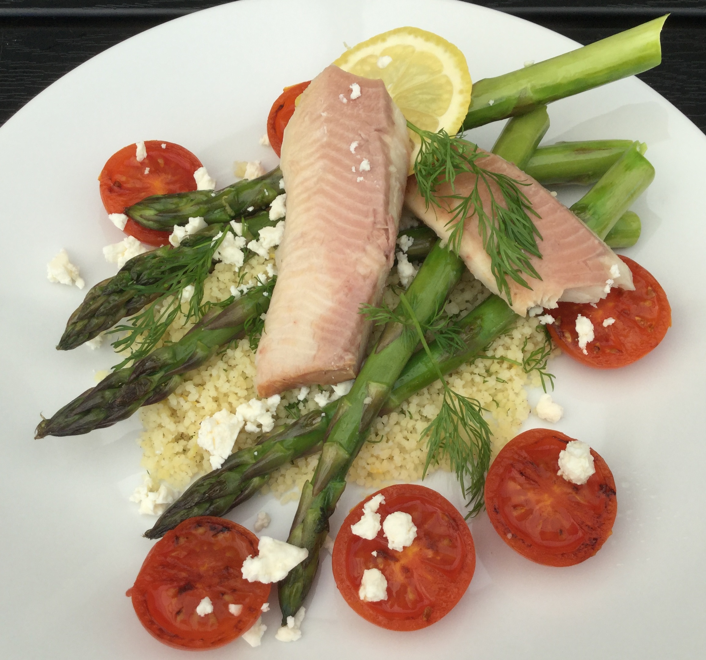 Varm olien i en stor pande og rist aspargesene i et par minutter - vend dem undervejs. Tag dem op og rist derefter tomaterne kort på skærefladen. Anret couscoussen med asparges og tomater, krydr med salt, peber og smuldr feta over. Læg ørredfilet på toppen og pynt med dildkviste og citronskiver.