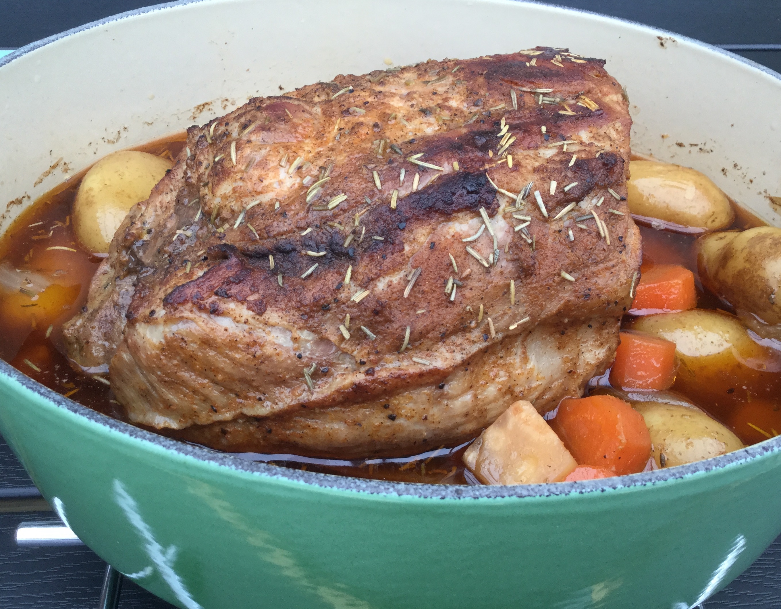 Vask kartoflerne grundigt og læg dem i stegesoen. Skær grøntsagerne groft og kom dem i stegesoen. Vend dem med olie, salt, peber og rosmarin.