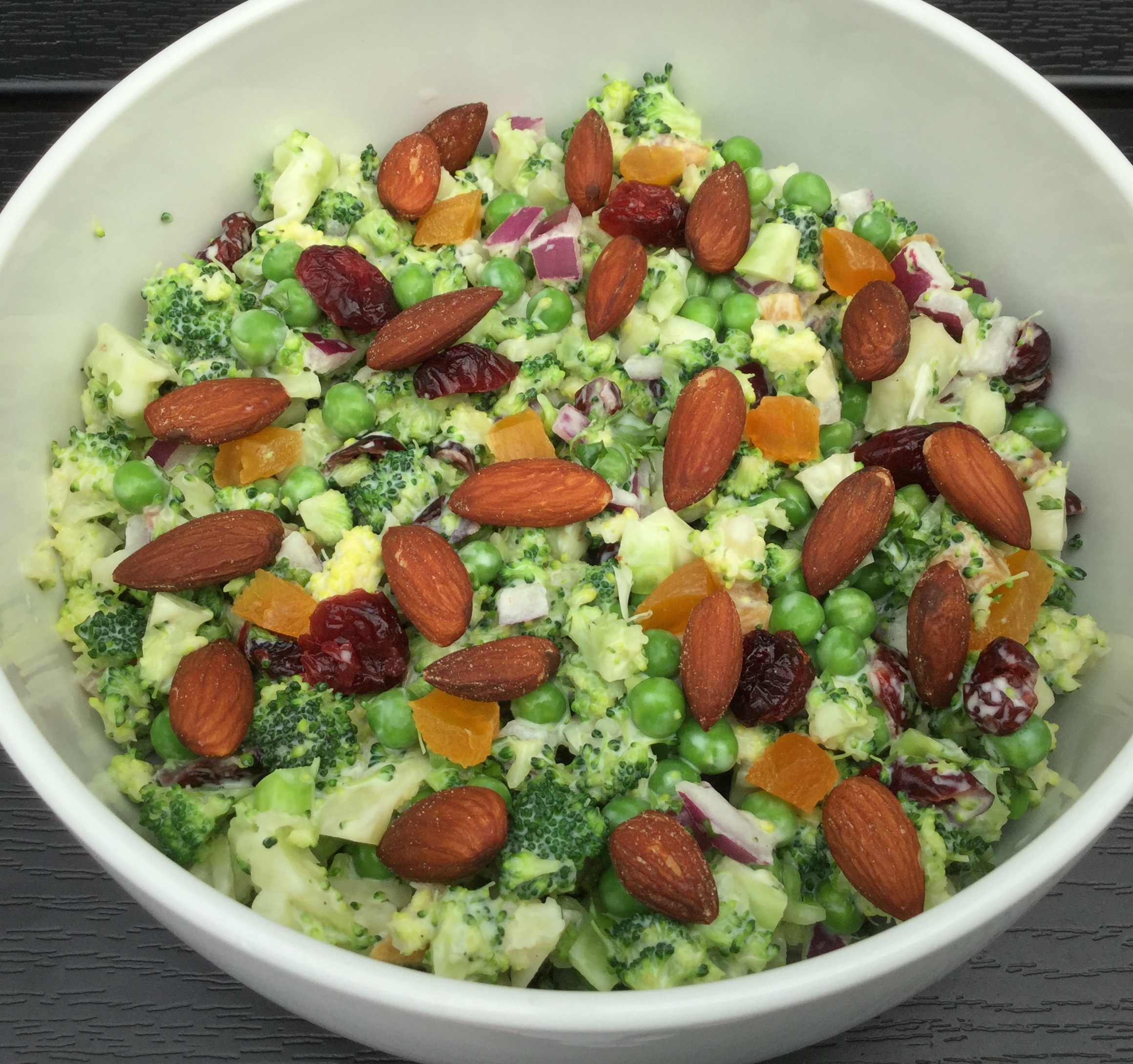 Bland broccoli, rødløg, abrikoser, tranebær, persille og ærter. Hæld dressingen over og vend rundt. Lad salaten trække lidt på køl. Ved serveringen pyntes med abrikostern, tranebær og saltmandler.