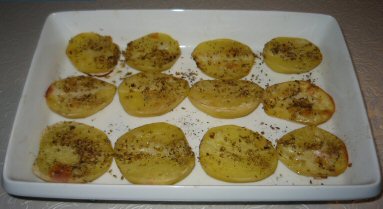 Kartoflerne skrælles og skæres i halve. Sættes i et ovnfast fad med snitfladen opad, hæld lidt flydende margarine over. Drys med salt og oregano. Bages i ovnen på midterste rille ved 200 grader i ca. 1 time.