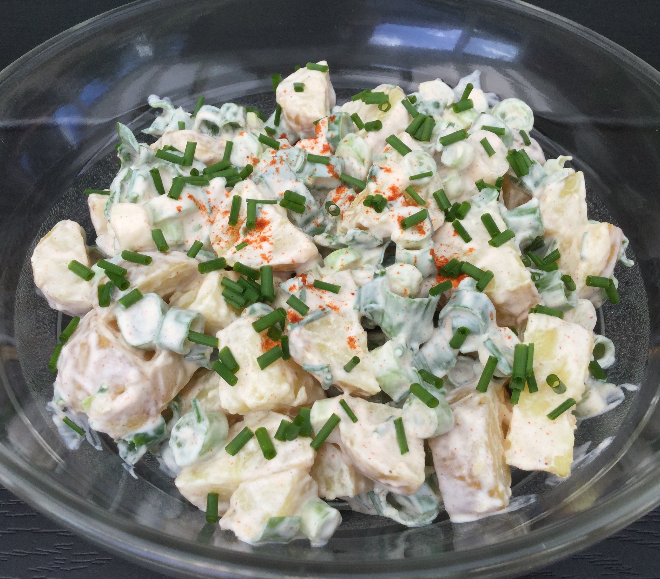 Skær kartofler i tern og snit forårsløgene fint. Rør creme fraiche med paprika, salt og peber. Vend kartofler, purløg og forårsløg i. Pynt med purløg.