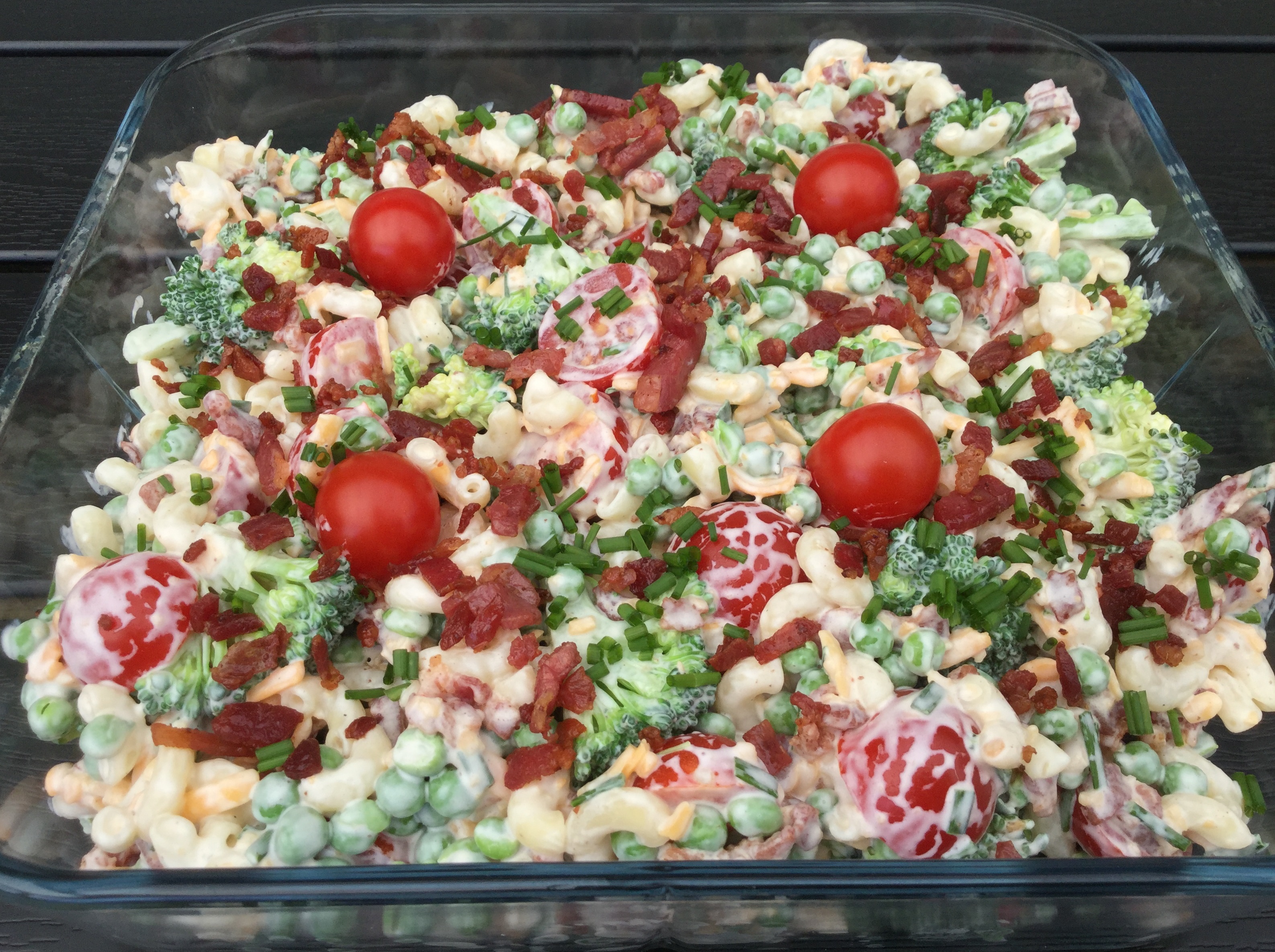 Vend bacontern, suppehorn, broccoli, ærter, tomater og cheddar i dressingen. Pynt med tomater, bacontern og finthakket purløg.