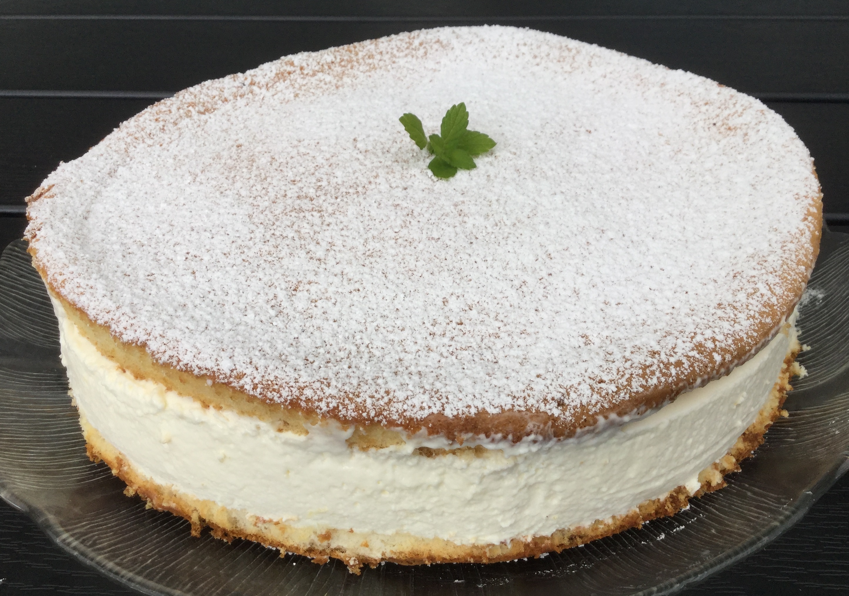 Læg husblassen i blød i koldt vand i ca. 10 minutter. Rør kvark med cremefraiche, sukker og citronskal. Træk husblassen op af vandet med det vand, der hænger ved. Smelt den i vandbad. Afkøl husblassen med citronsaft og kom den i kvarkblandingen under omrøring. Pisk fløden stiv og vend den forsigtigt i cremen. Anbring en lagkagebund i en springform (uden bund) på et serveringsfad og fordel kvarkcremen herpå. Læg den anden lagkagebund oven på. Stil kvarkkagen koldt i nogle timer. Pynt med sigtet flormelis.