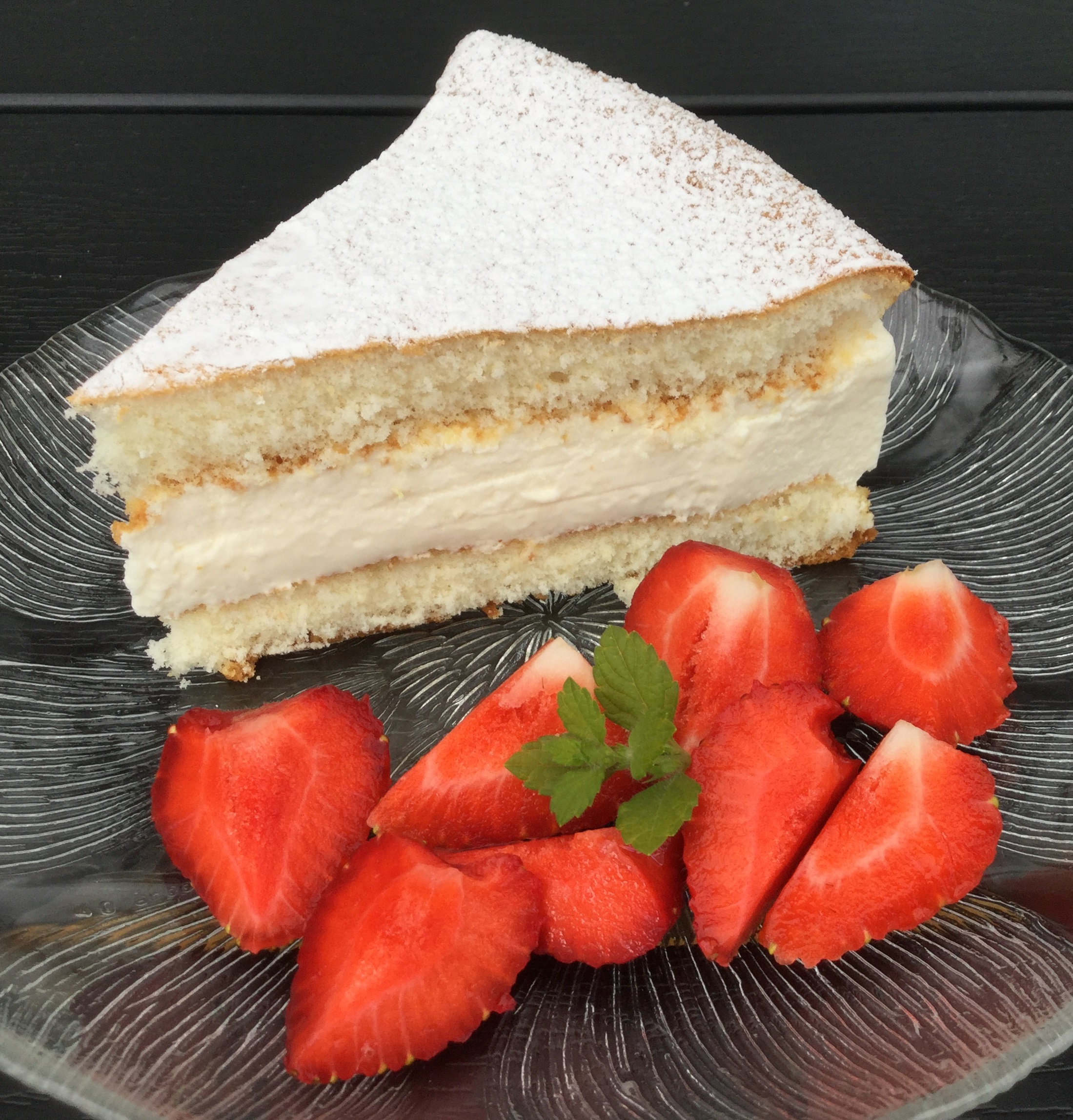 Server kvarkkagen med frisk frugt.