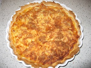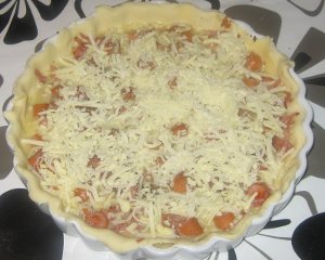 Smør et tærtefad (ca. 24 cm). Pak tærtedejen ud og rul den over fadet. Fjern evt. det overflødige dej.