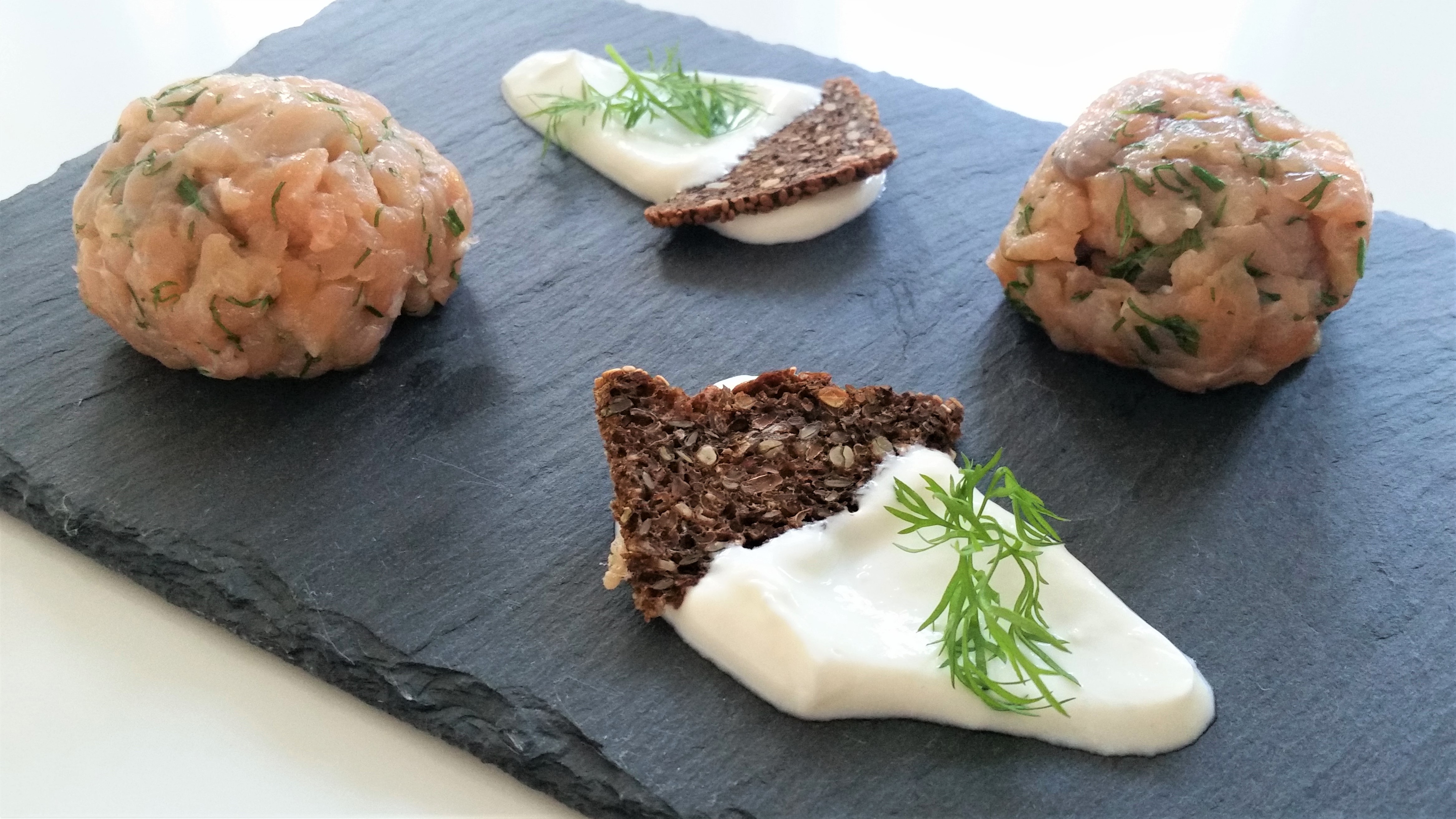 Hak laks, dild og purløg fint og blandt det sammen til en fast masse.