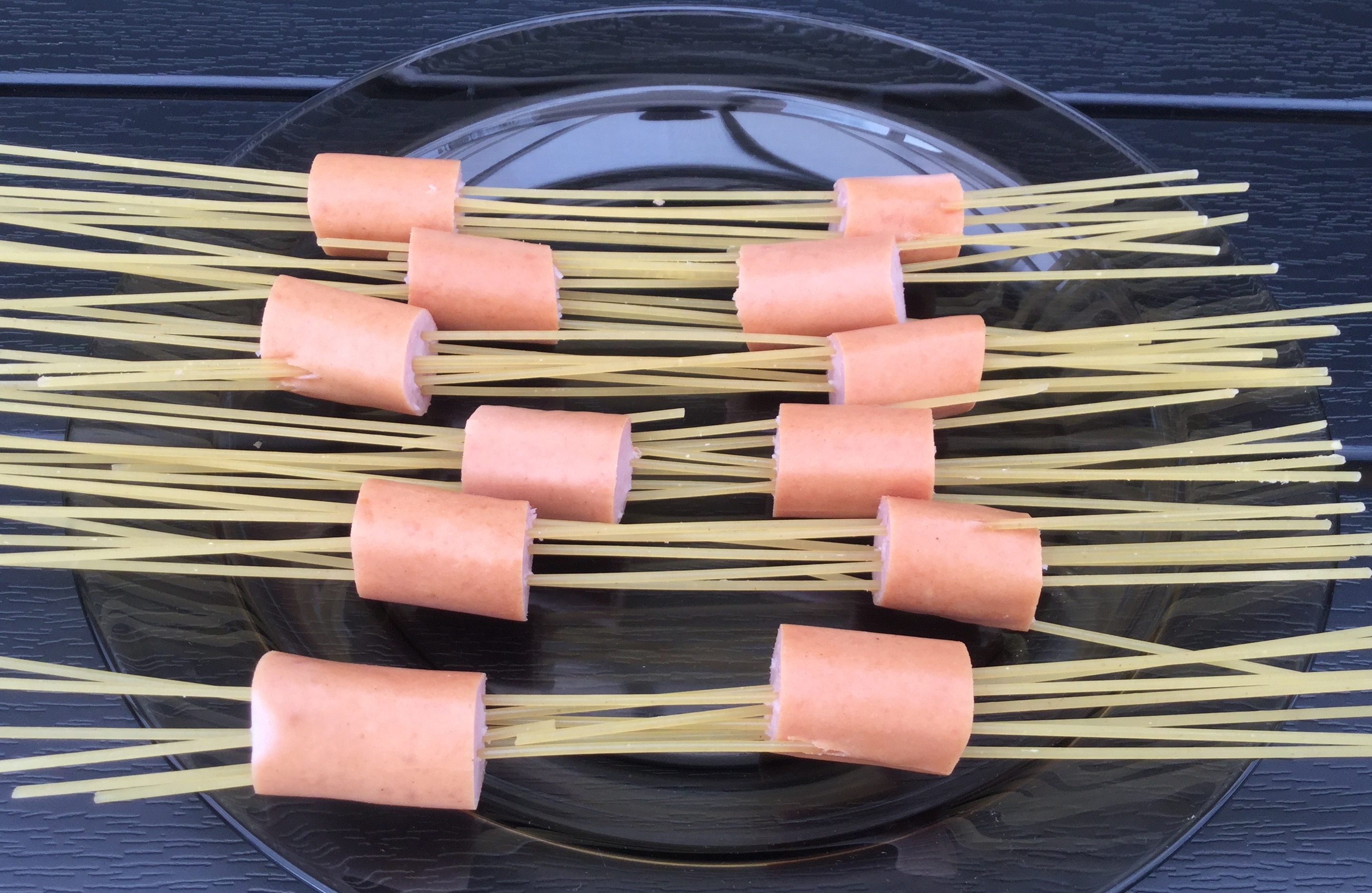 Stik de tørrede spaghetti gennem pølsestykkerne. Brug 7 spaghetti ad gangen. Det er bedst med 2-3 pølsestykker på hver.