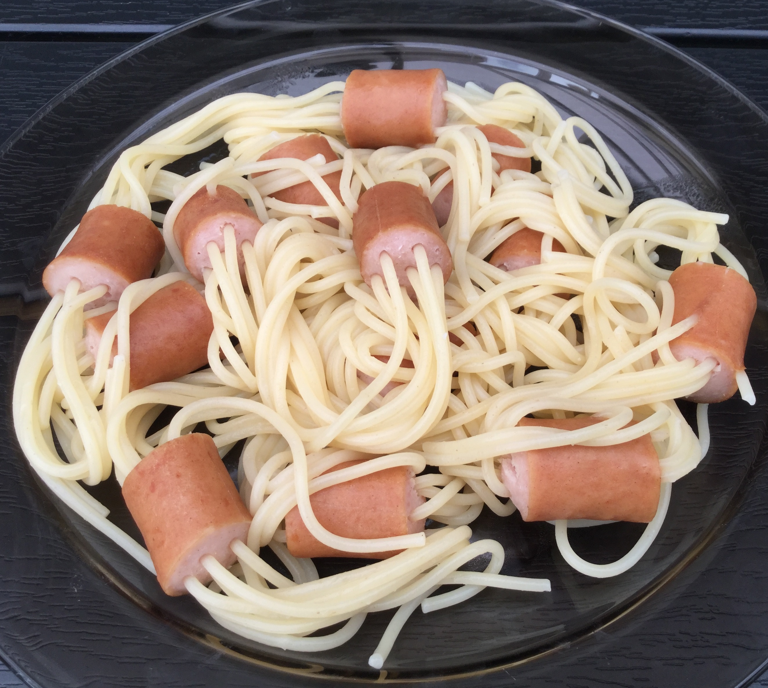Læg spaghettipølserne i det kogende vand og kog dem i 8 minutter. Efter 8 minutter hældes spaghettipølserne op i et dørslag, så vandet kan løbe fra.
