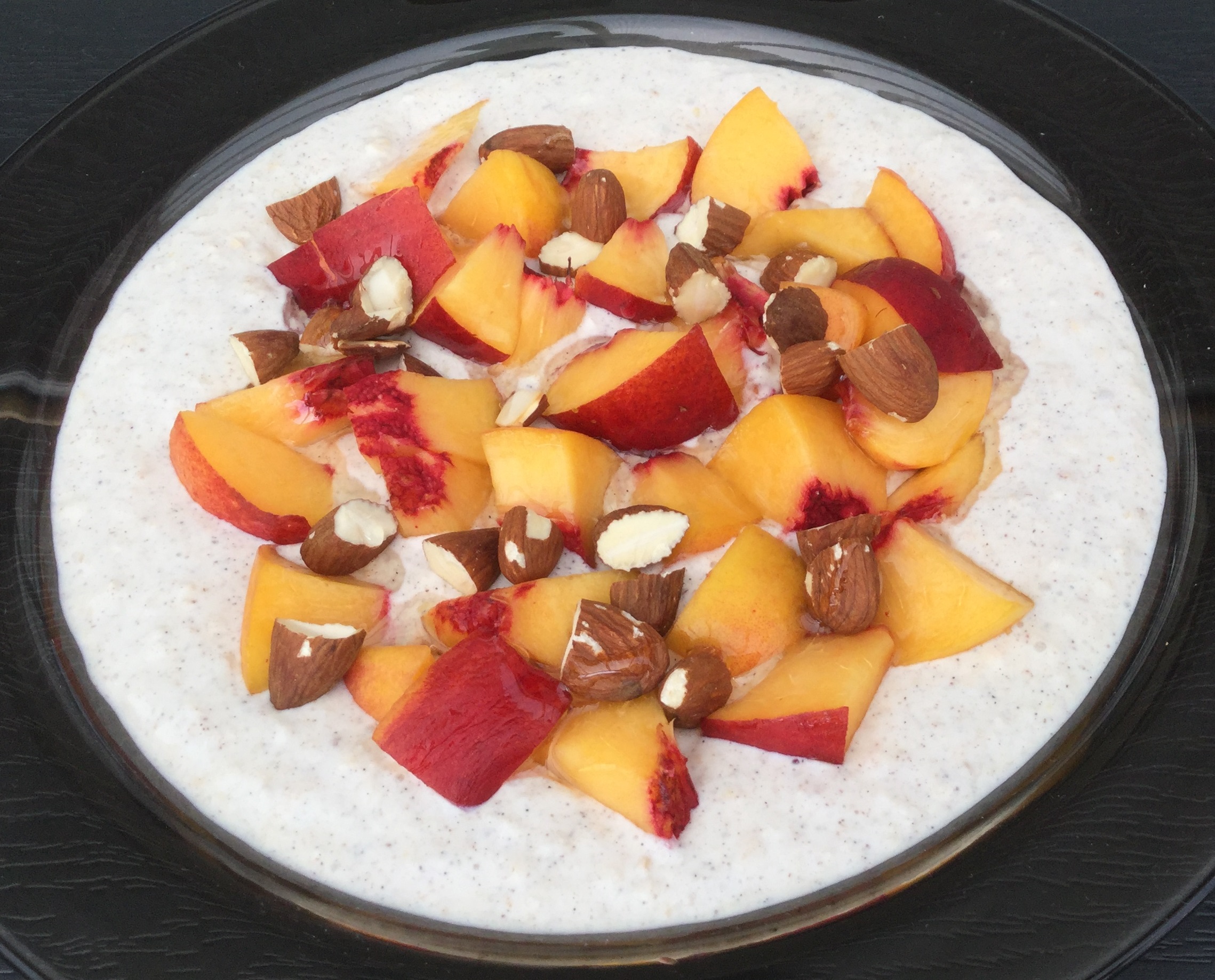 Rør græsk yoghurt i grøden. Pynt med nektarin, mandler og lidt akaciehonning.
