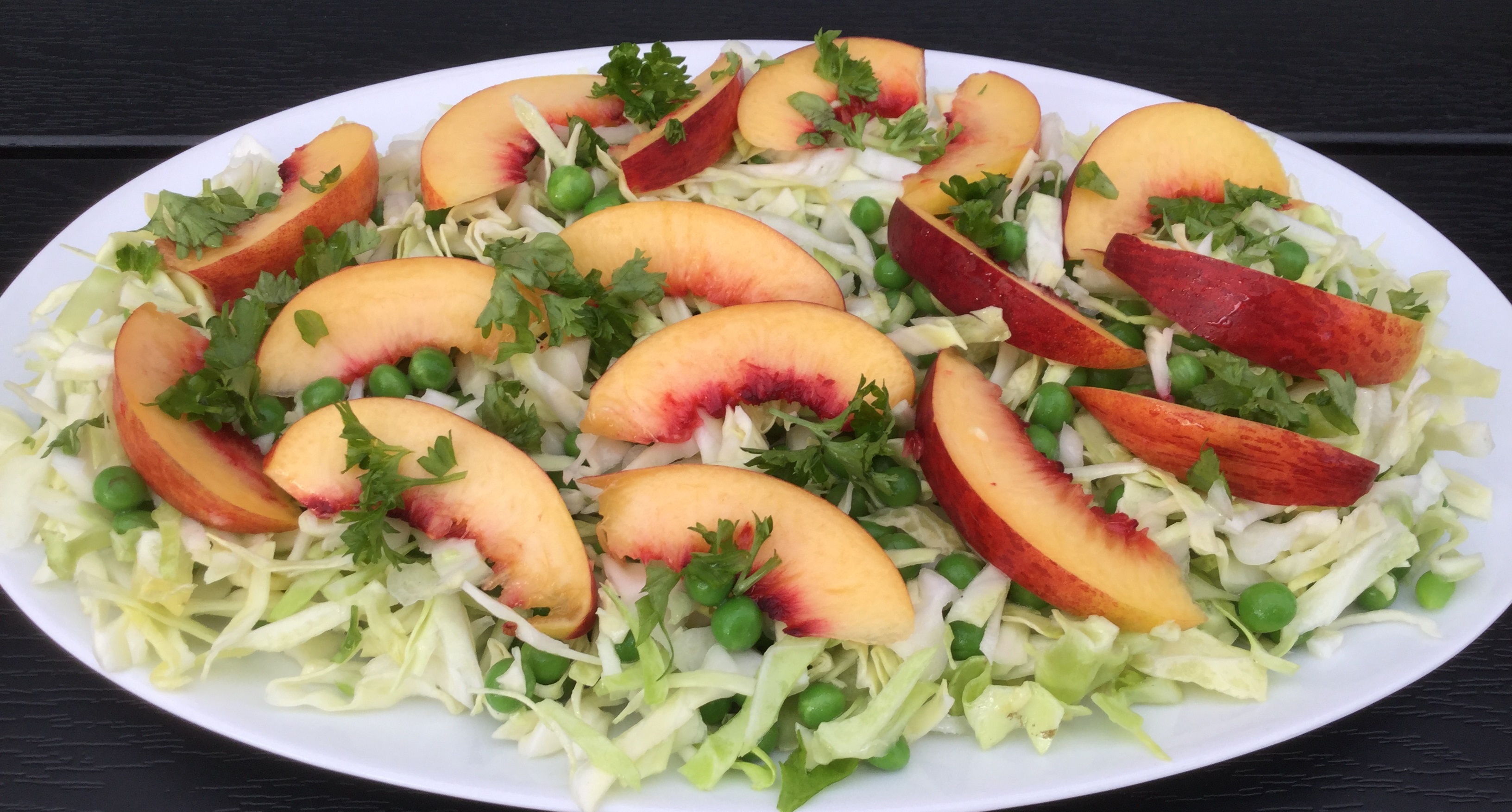 Snit spidskålen fint og bland den med ærterne. Hæld dressingen over og vend rundt. Anret salaten på et fad. Skær nektarinerne i tynde både og fordel dem over salaten. Pynt med hakket persille.