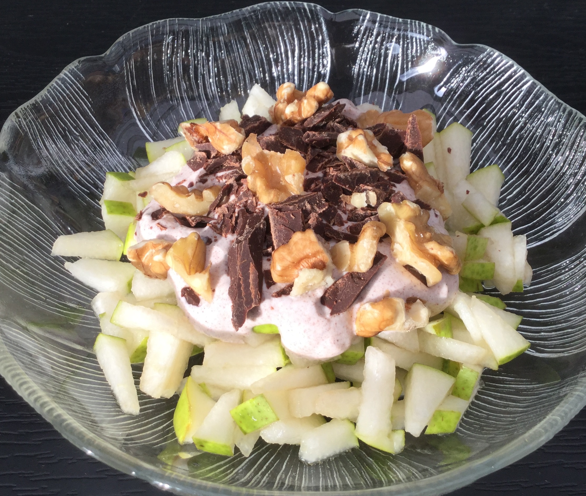 Skær pærerne i tynde strimler. Vend pærestrimlerne med ahornsirup i en stor skål så snart de er skåret ud. Fordel pærerne i 4 dybe tallerkener eller skåle. Kom 2 spsk. kanelcreme på toppen af hver portion og drys med chokolade og valnødder.